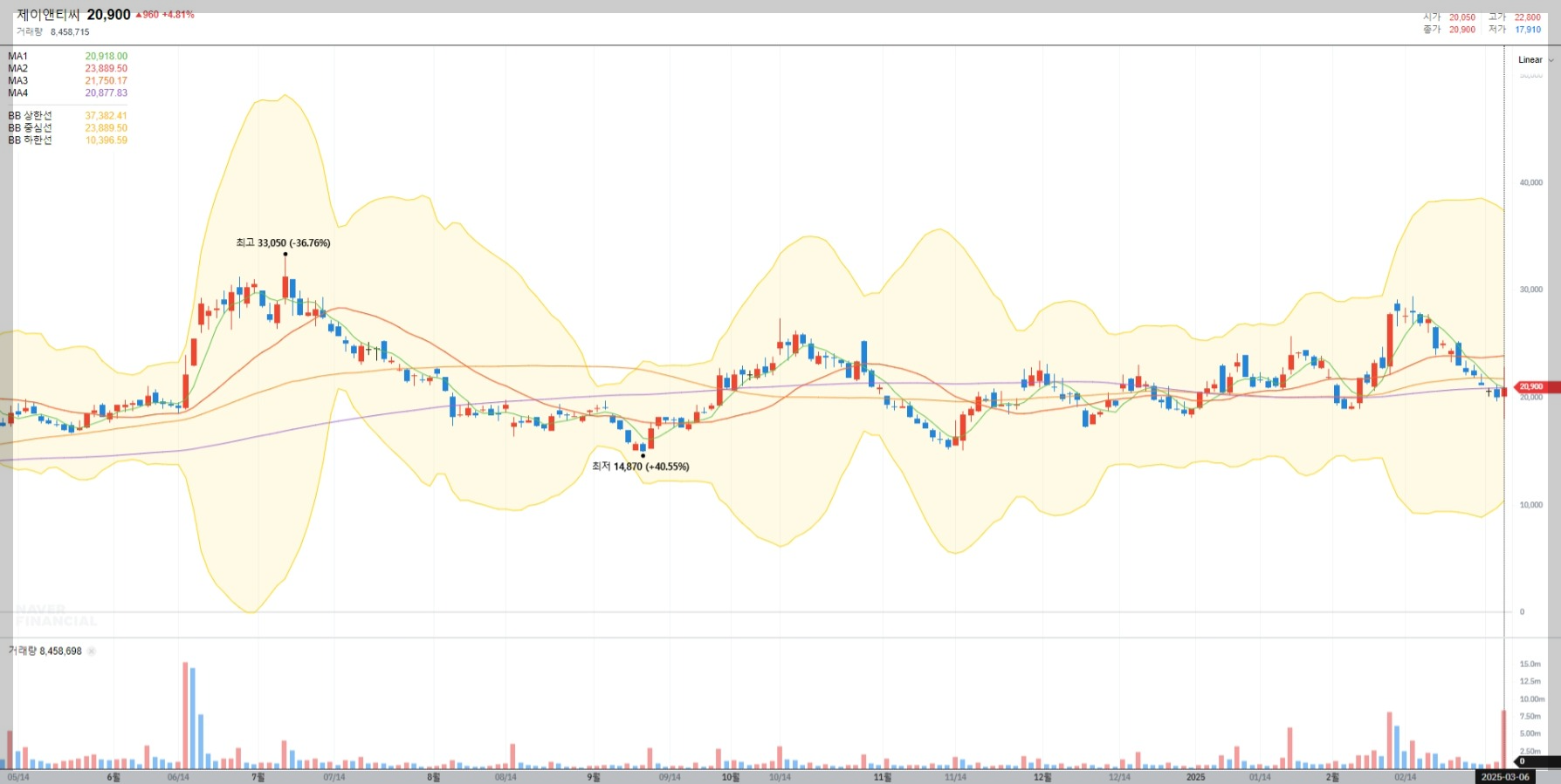 2025년 3월 6일 기준 제이앤티씨의 주가는 20,900원으로 거래되고 있습니다. 최근 변동성은 다소 높았으며, 최고가는 33,050원, 최저가는 14,870원을 기록했습니다. 현재 주가는 기술적 분석상 볼린저밴드 하단에 위치하고 있어 단기 반등 가능성이 점쳐지고 있습니다.