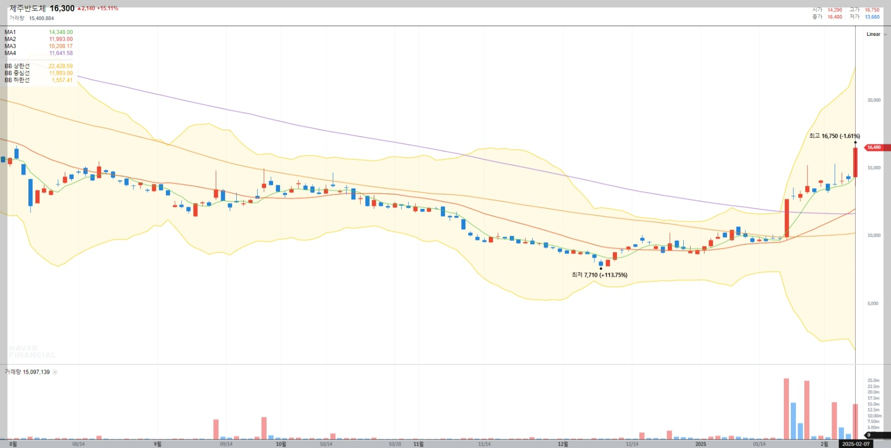 2025년 2월 7일 기준 제주반도체의 주가는 16,300원으로 전일 대비 15.11% 상승했습니다. 이는 화웨이 등 글로벌 기업과의 협력 강화와 온디바이스 AI 수요 확대에 따른 긍정적 모멘텀 덕분입니다.