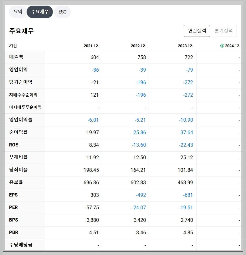 - 매출액: 2023년 기준 722억 원으로 전년 대비 감소.