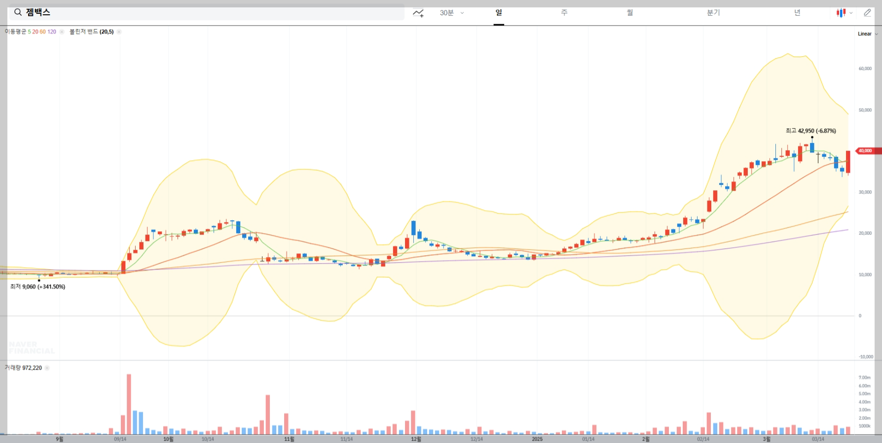 볼린저밴드 매매기법으로 분석하면 현재 젬백스의 주가는 상단 밴드에 근접해 있어 단기 조정 가능성을 염두에 두어야 합니다. 하지만 중장기적으로는 긍정적인 흐름이 예상됩니다.