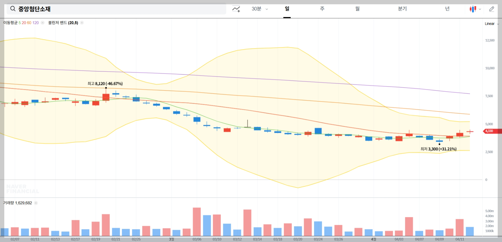 볼린저밴드를 활용한 중앙첨단소재 주식 매매 전략을 살펴보겠습니다. 볼린저밴드의 기본적인 매매기법은 주가가 볼린저 밴드 상한선에 근접하면 매도, 하한선에 근접하면 매수하는 방법입니다.