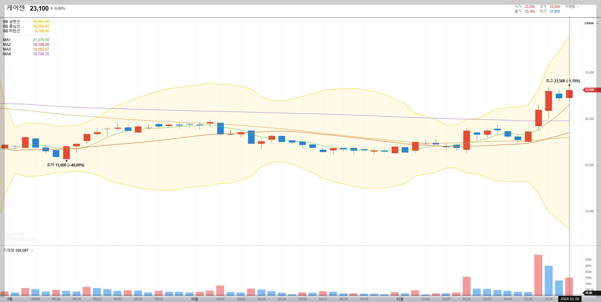 볼린저밴드 분석에 따르면 케어젠의 주가는 현재 상단 밴드를 돌파하며 강한 상승 추세를 보이고 있습니다. 이는 단기적으로 추가 상승 가능성을 시사하며 투자자들에게 긍정적인 신호로 작용할 수 있습니다.