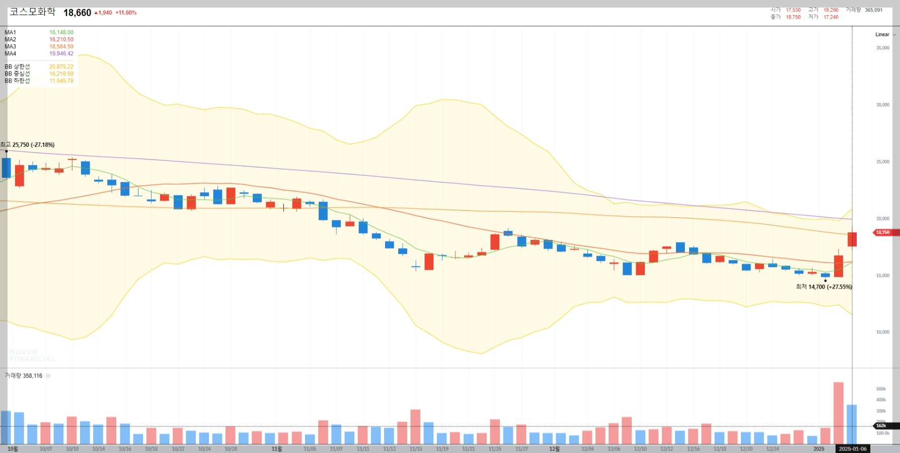 볼린저 밴드는 주가의 변동성을 측정하는 기술적 지표로, 중심선(20일 이동평균선)과 상·하한선(±2 표준편차)으로 구성됩니다. 현재 코스모화학의 차트를 보면, 최근 하단 밴드에서 반등하여 상단 밴드를 돌파하는 강세 신호를 보이고 있습니다. 이는 추가 상승 가능성을 시사합니다.