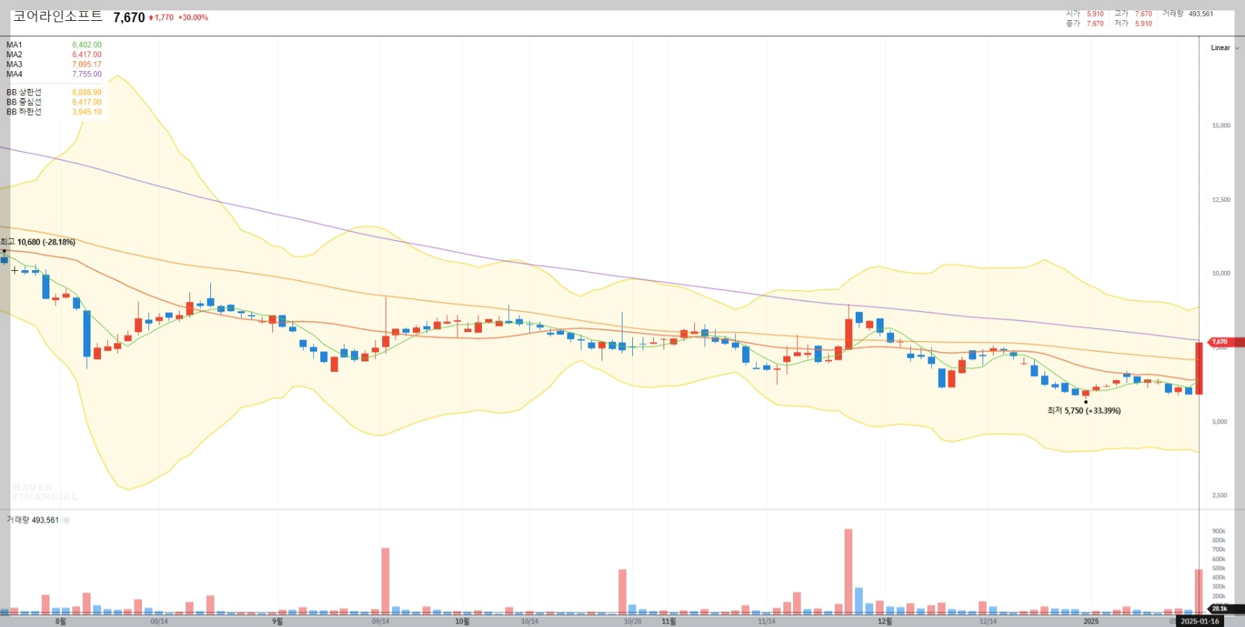 현재 코어라인소프트의 주가는 7,670원으로 상한가를 기록했습니다. 이는 최근 저점인 5,750원 대비 약 33% 상승한 수치입니다. 그러나 상장 초기 공모가(46,000원)와 비교하면 여전히 낮은 수준입니다.