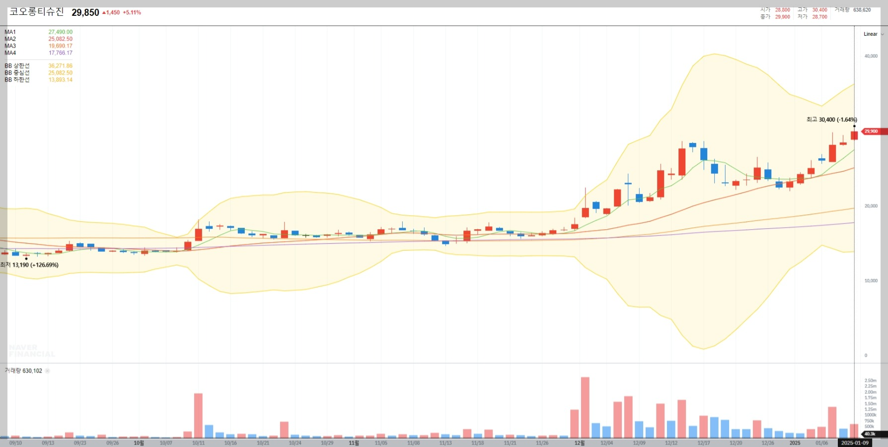현재 코오롱티슈진의 주가는 29,850원으로, 전일 대비 5.11% 상승했습니다. 최근 몇 달간 꾸준히 상승세를 보이며 투자자들의 기대를 모으고 있습니다.