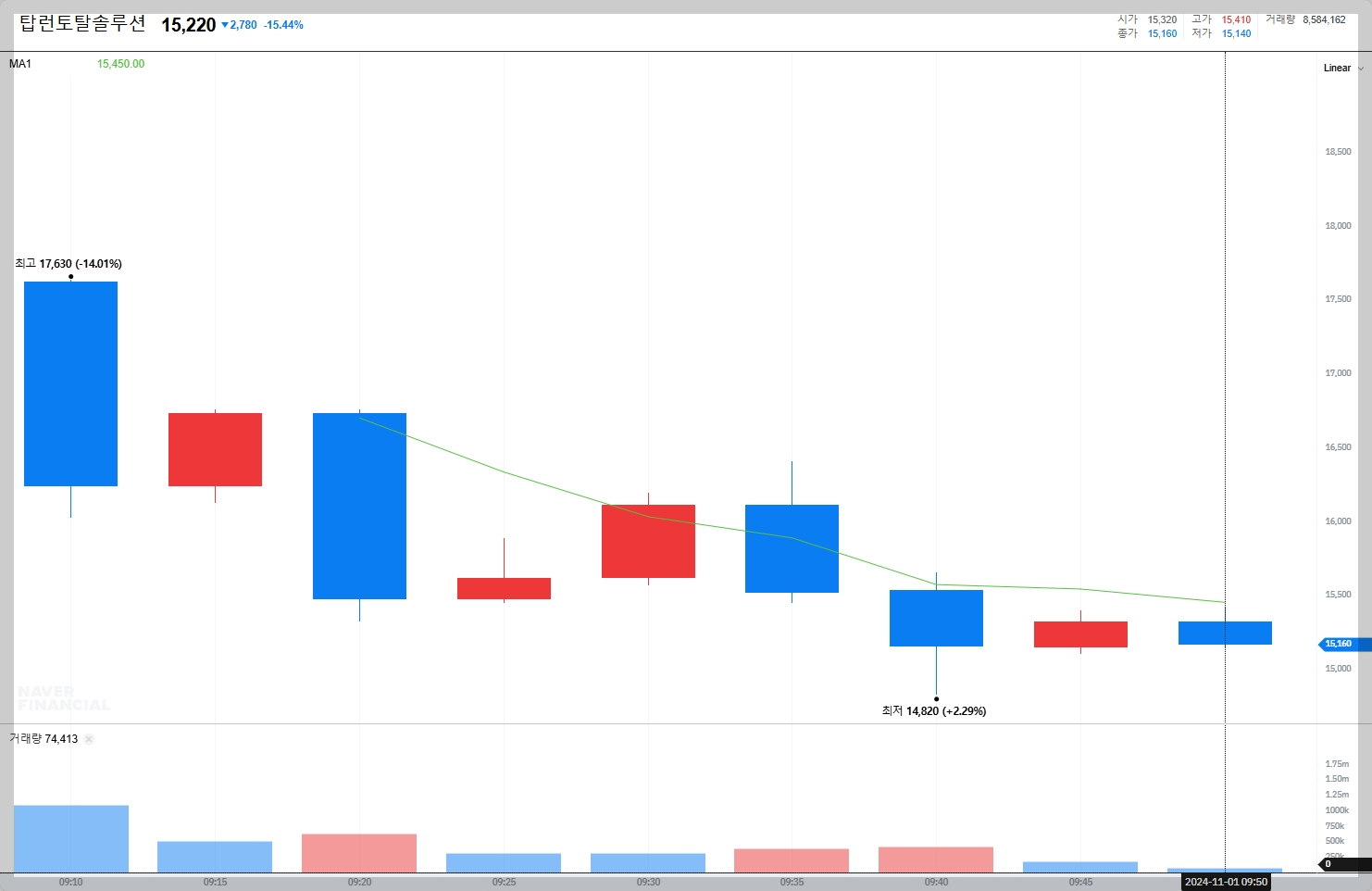 탑런토탈솔루션의 주가는 현재 15,220원으로, 상장 첫날의 공모가에 비해 15.44% 하락했습니다.