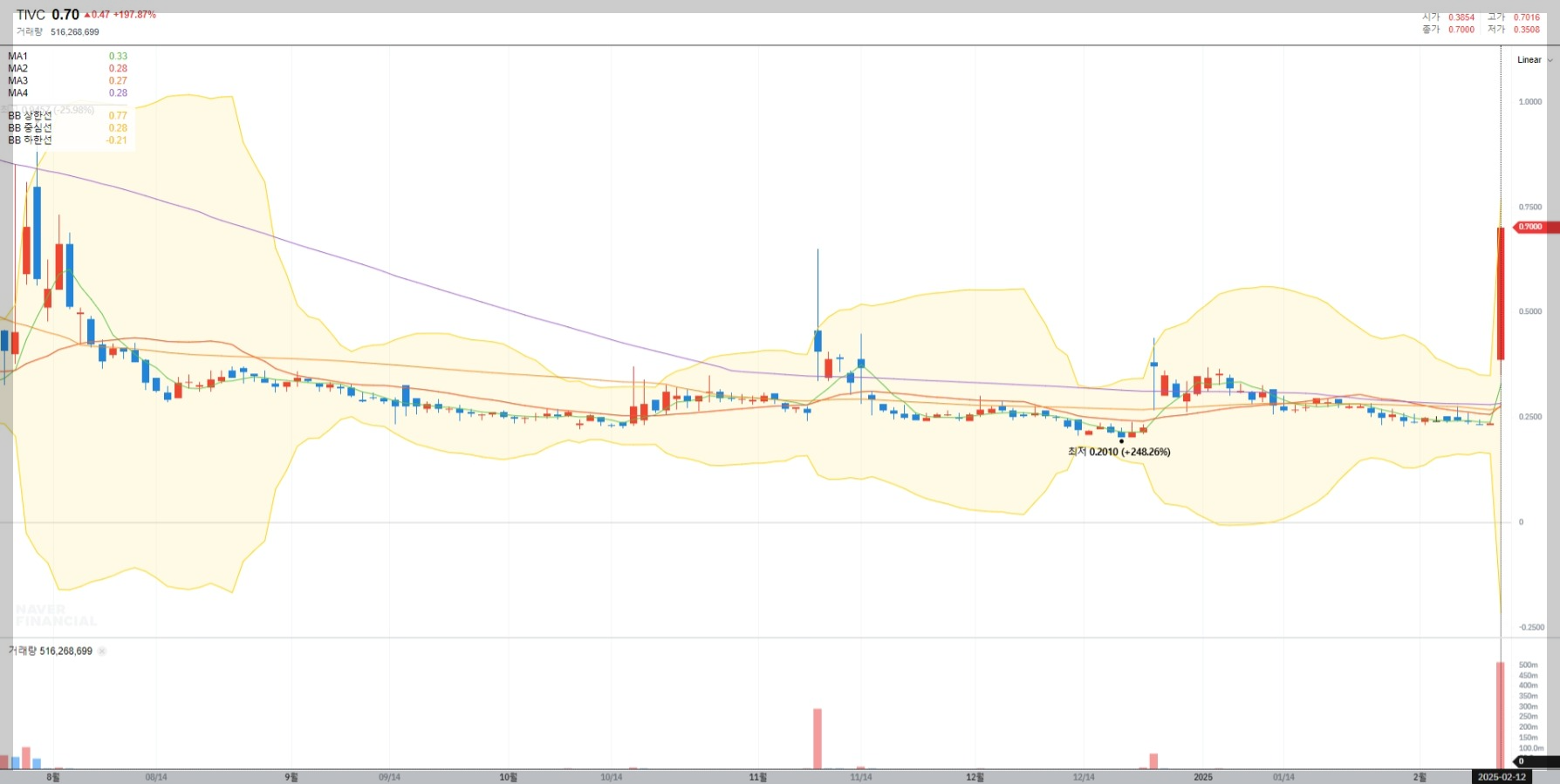 볼린저밴드 차트를 보면 현재 TIVC의 주가는 상단 밴드를 돌파한 상태입니다. 이는 과매수 신호로 해석될 수 있으며, 조정 가능성을 염두에 두고 매매 전략을 세우는 것이 중요합니다.