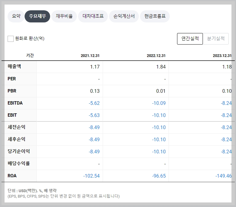 - 매출액: 2023년 기준 $1.18억으로 전년 대비 감소