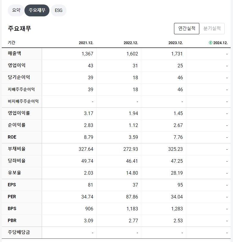 - 리스크: 높은 부채비율(325%)과 낮은 영업이익률은 재무 안정성에 부담을 줄 수 있습니다.