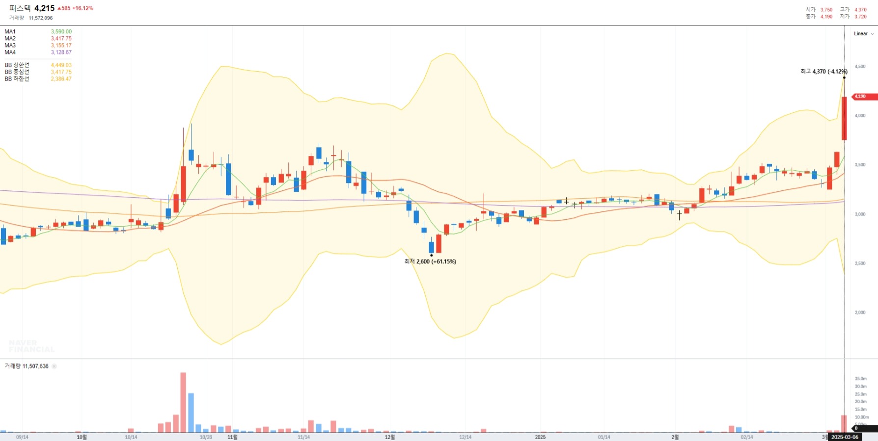 2025년 3월 6일 기준, 퍼스텍의 주가는 4,215원으로 전일 대비 16.12% 상승했습니다. 이는 단기적으로 투자자들의 높은 관심을 반영하며 거래량도 급증한 모습입니다.
