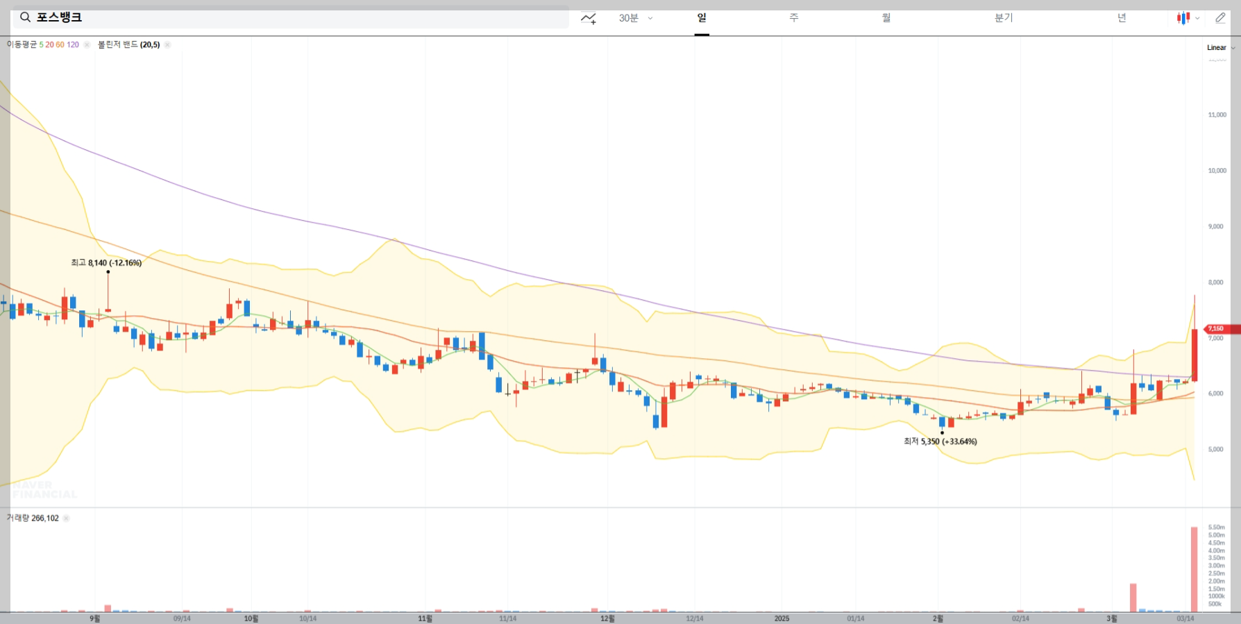 2025년 3월 17일 기준 포스뱅크의 주가는 7,190원으로 전일 대비 15.59% 상승했습니다. 최근 거래량 증가와 함께 투자자들의 관심이 집중되고 있습니다.