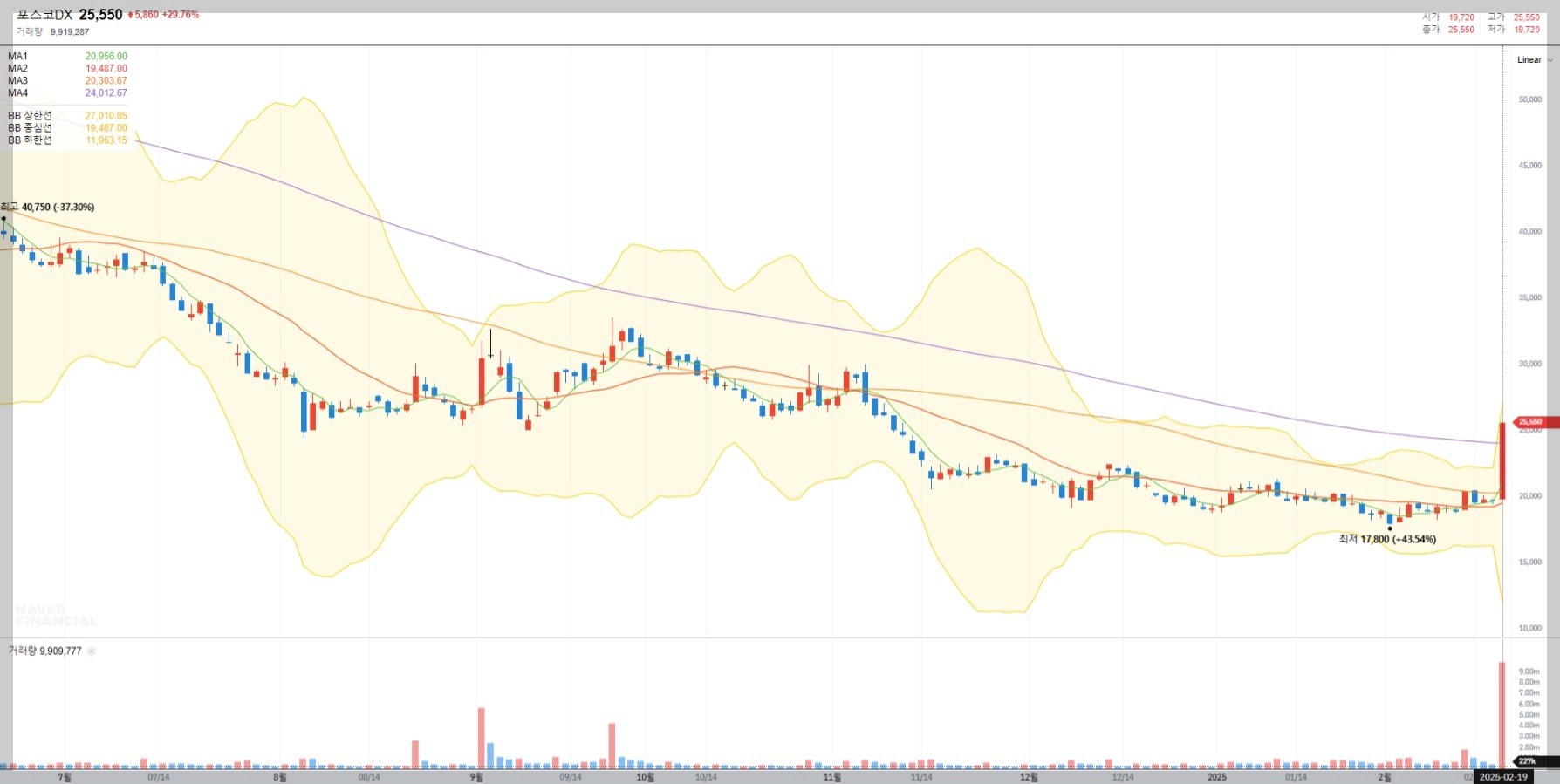 2025년 2월 19일 기준 포스코DX의 주가는 25,550원으로 전일 대비 29.76% 상승했습니다. 이는 시장에서 강한 매수세가 유입된 결과로 보이며, 단기적으로 상승 추세를 유지할 가능성이 있습니다.