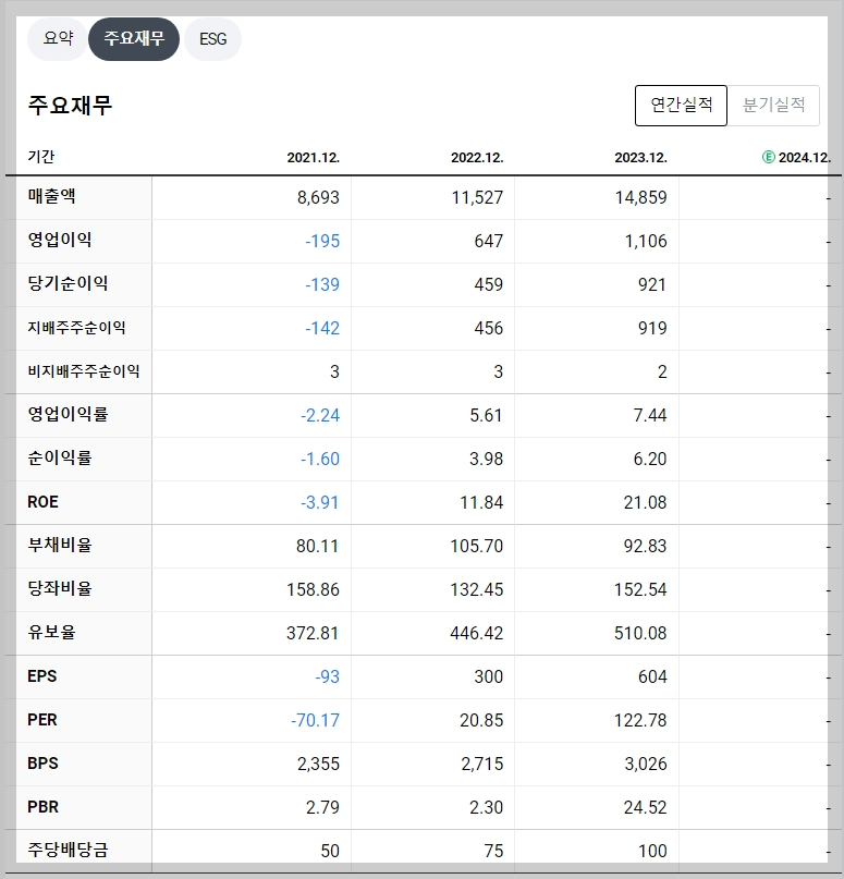 2023년 포스코DX의 매출액은 14,859억 원으로 전년 대비 약 29% 증가했습니다. 영업이익률은 7.44%로 꾸준히 개선되고 있으며, ROE(자기자본이익률)는 21.08%로 높은 수익성을 보여줍니다. 부채비율은 92.83%로 안정적인 수준입니다.