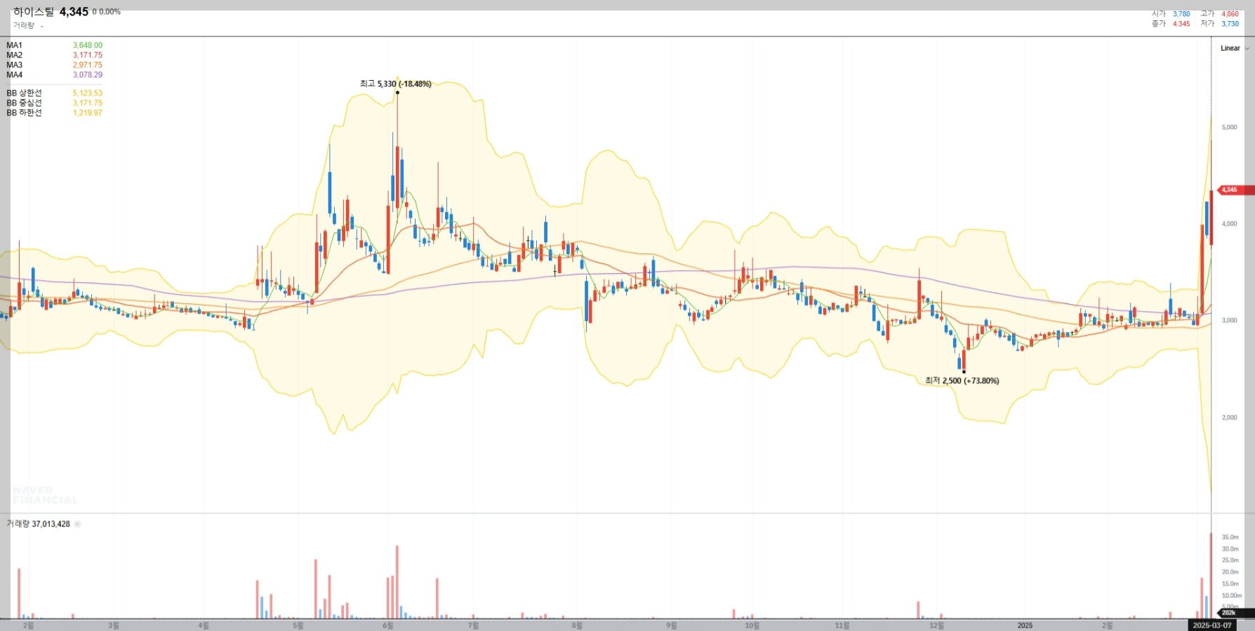 하이스틸의 2025년 3월 08일 기준 주가는 4,345원으로, 단기간 내 급격한 상승세를 보이며 투자자들 사이에서 화제가 되고 있습니다. 비교적 저평가된 철강 기업임에도 불구하고 시장에서 꾸준히 관심을 받고 있으며, 주가가 볼린저밴드 상단을 돌파한 모습이 긍정적인 신호로 해석됩니다.