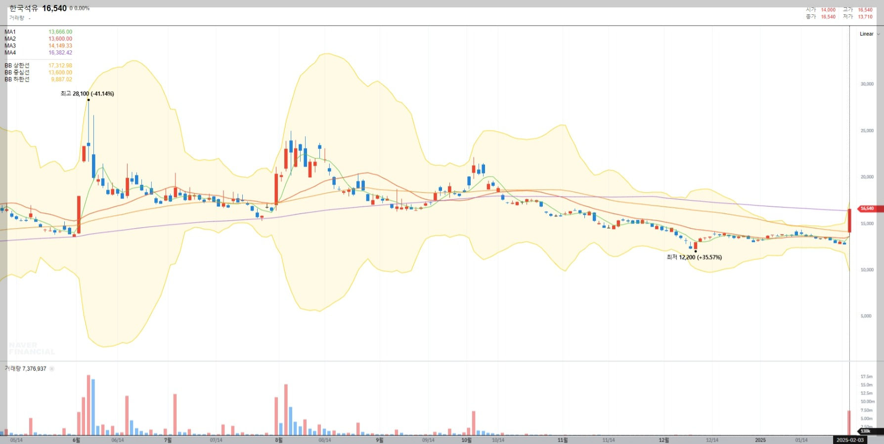 현재 한국석유의 주가는 16,540원으로 최근 저점인 12,200원에서 약 35% 상승했습니다. 이는 투자자들의 기대감이 반영된 결과로 보입니다.