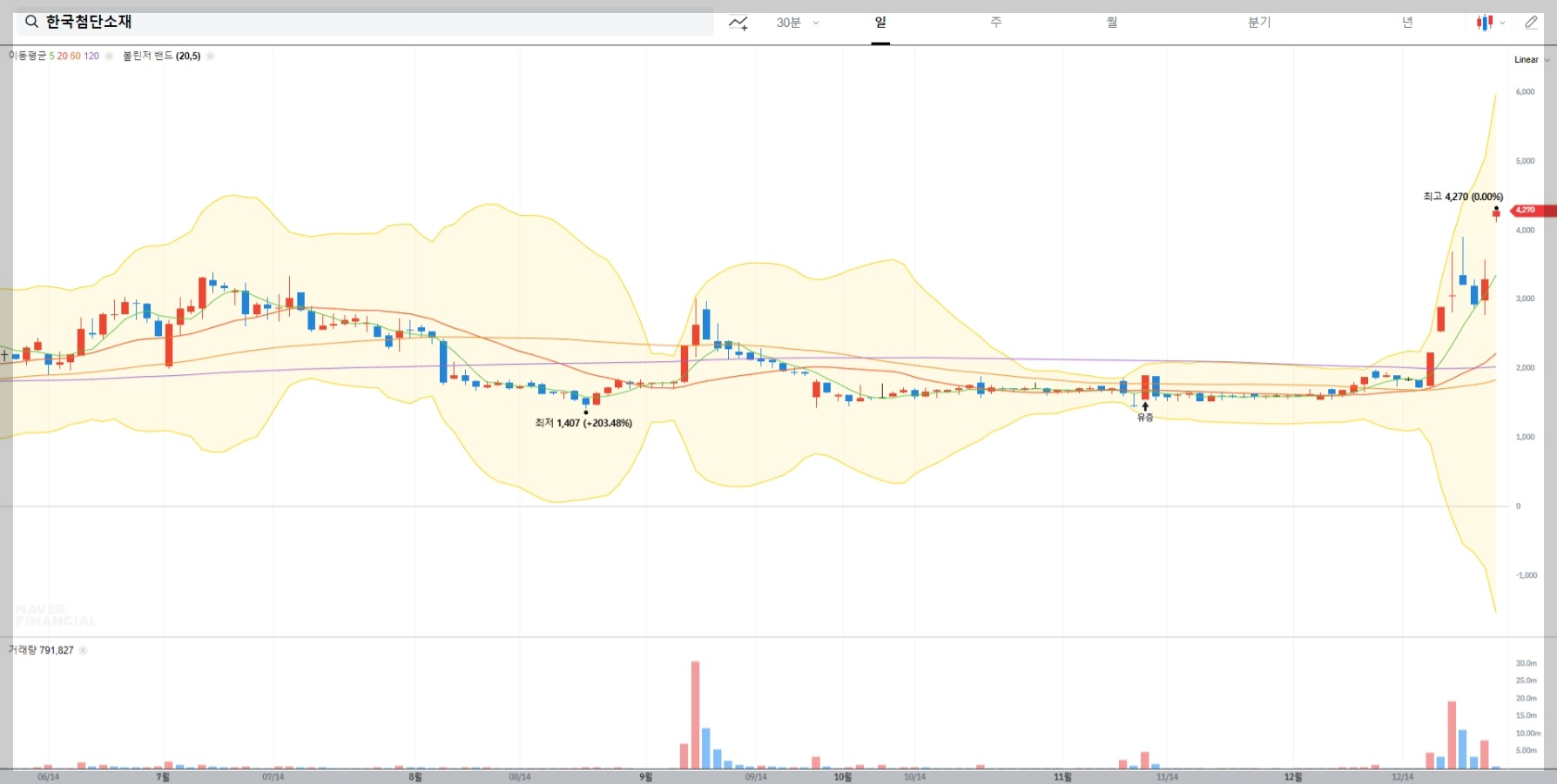 2024년 12월 27일 기준 한국첨단소재의 주가는 4,270원으로 급등세를 보이고 있습니다. 이는 양자통신 기술 개발과 같은 호재 뉴스가 반영된 결과로 풀이됩니다.