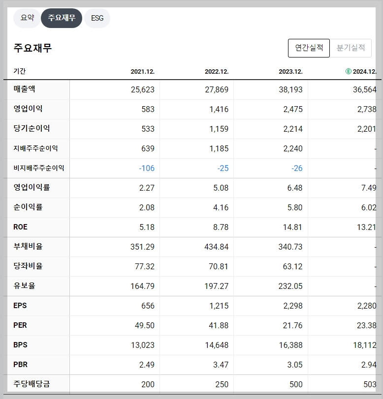2023년 기준 영업이익률은 6.48%, ROE는 14.81%로 우수한 수익성을 보여줍니다. 부채비율은 340%대로 다소 높으나 안정적인 현금 흐름이 이를 상쇄하고 있습니다.