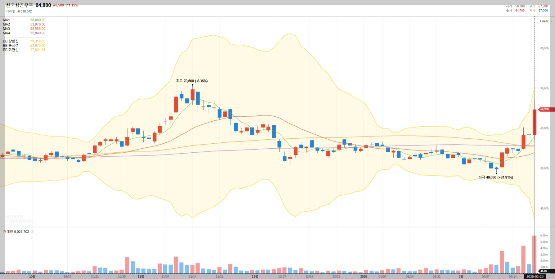 2025년 2월 20일 기준, 한국항공우주의 현재 주가는 64,800원으로 전일 대비 11.15% 상승했습니다. 이는 최근 실적 개선과 시장 기대감이 반영된 결과로 보입니다.