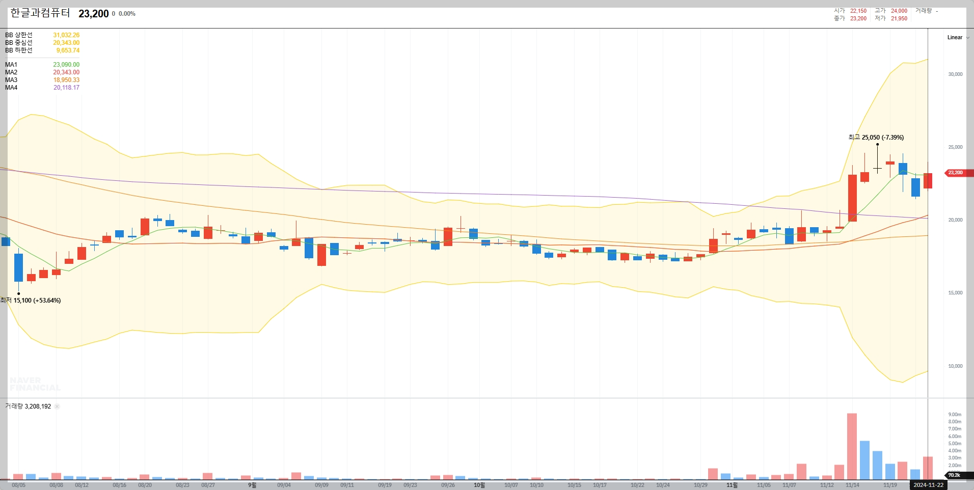 2024년 11월 기준, 한글과컴퓨터의 주가는 23,200원으로 최근 몇 달간 상승세를 보였습니다. 이는 회사의 성장 가능성과 긍정적인 시장 반응을 반영한 결과로 보입니다.
