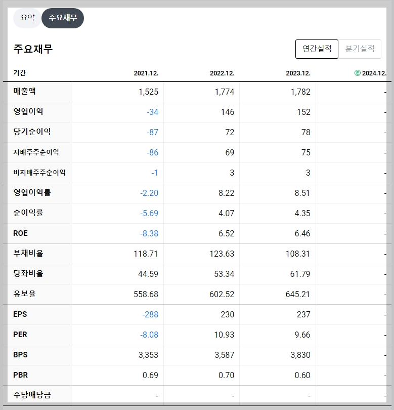 2023년 한일단조의 매출액은 1,782억 원으로 전년 대비 소폭 증가했으며 영업이익률은 8.51%로 안정적인 수익성을 유지하고 있습니다. ROE(자기 자본이익률)는 6.46%로 양호한 수준입니다.