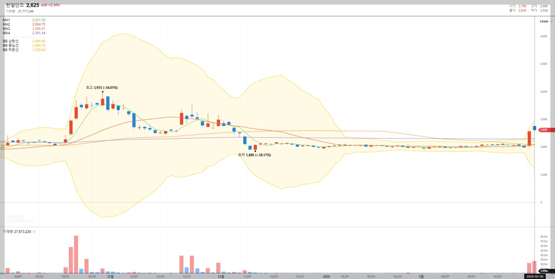 2025년 3월 4일 기준 한일단조의 현재 주가는 2,625원으로 전 거래일 대비 약 22% 상승했습니다. 이는 투자 심리가 개선되고 거래량이 급증한 결과로 풀이됩니다.