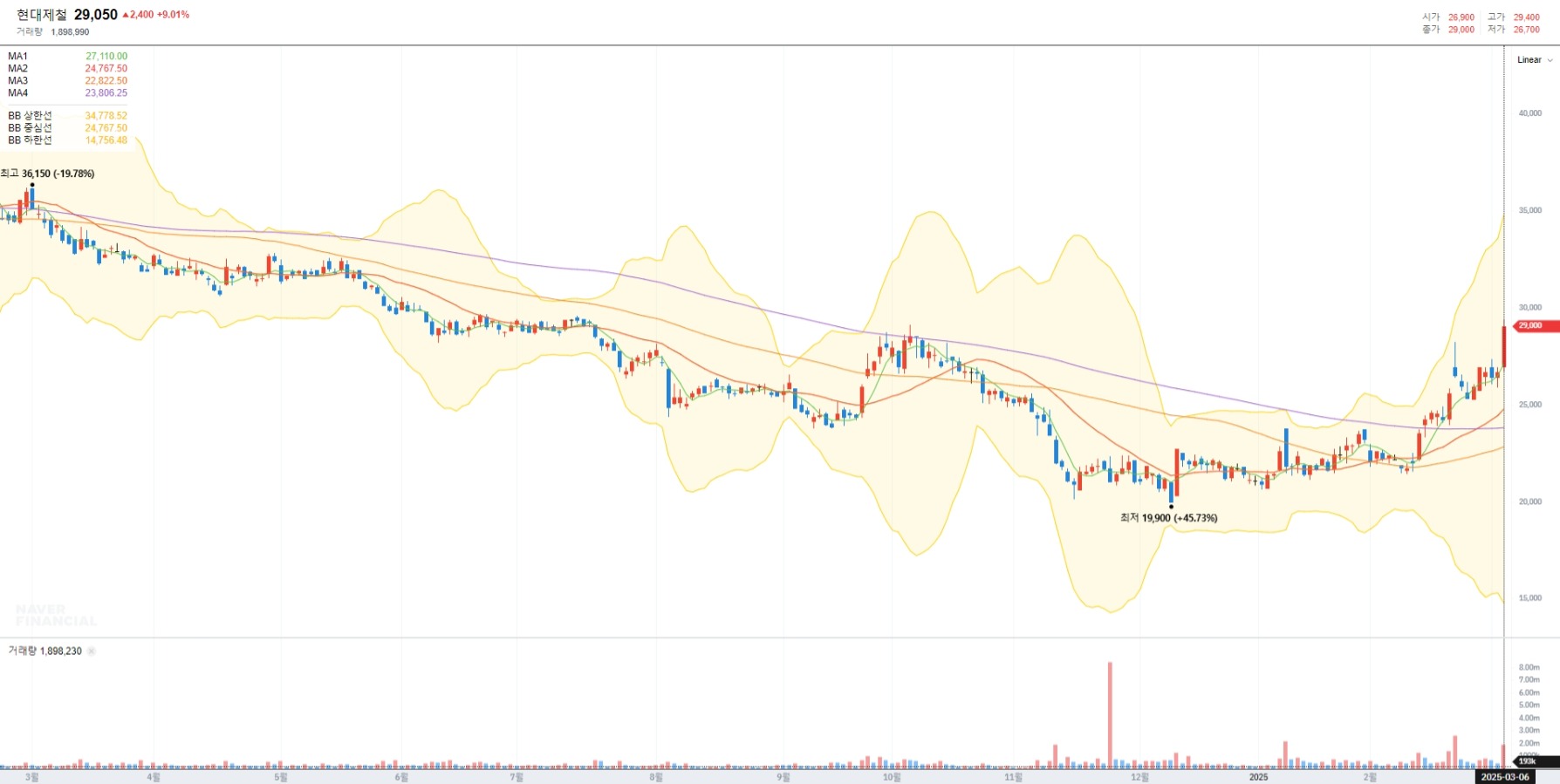 2025년 3월 6일 기준 현대제철의 주가는 29,050원으로 전일 대비 9.01% 상승했습니다. 최근 저점인 19,900원 대비 약 45% 이상 반등하며 투자자들의 관심을 받고 있습니다.