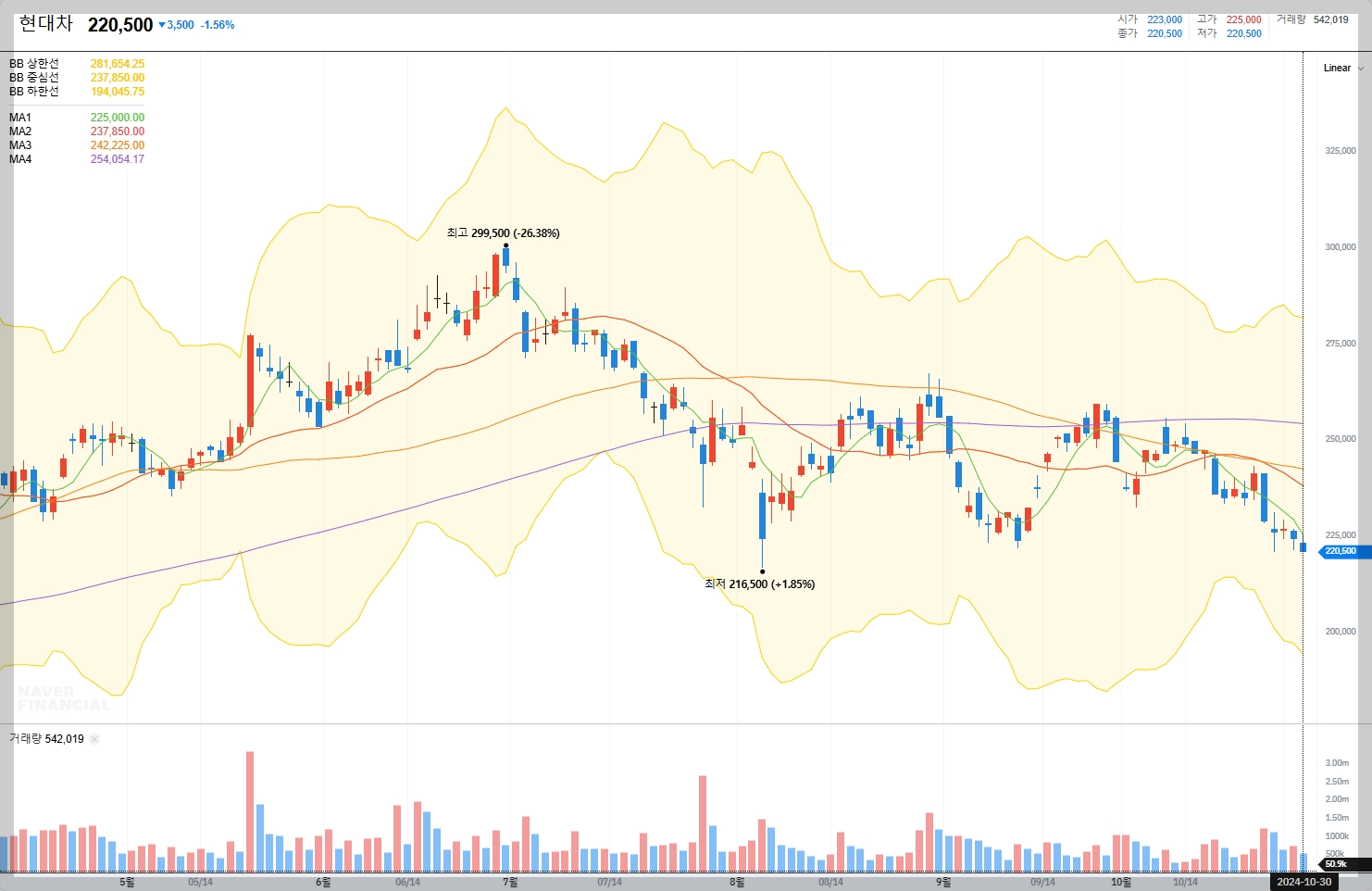2024년 10월 30일 기준, 현대차의 주가는 220,500원으로 전일 대비 1.56% 하락했습니다. 최근 주가 변동은 글로벌 자동차 시장의 변화와 관련이 있습니다.