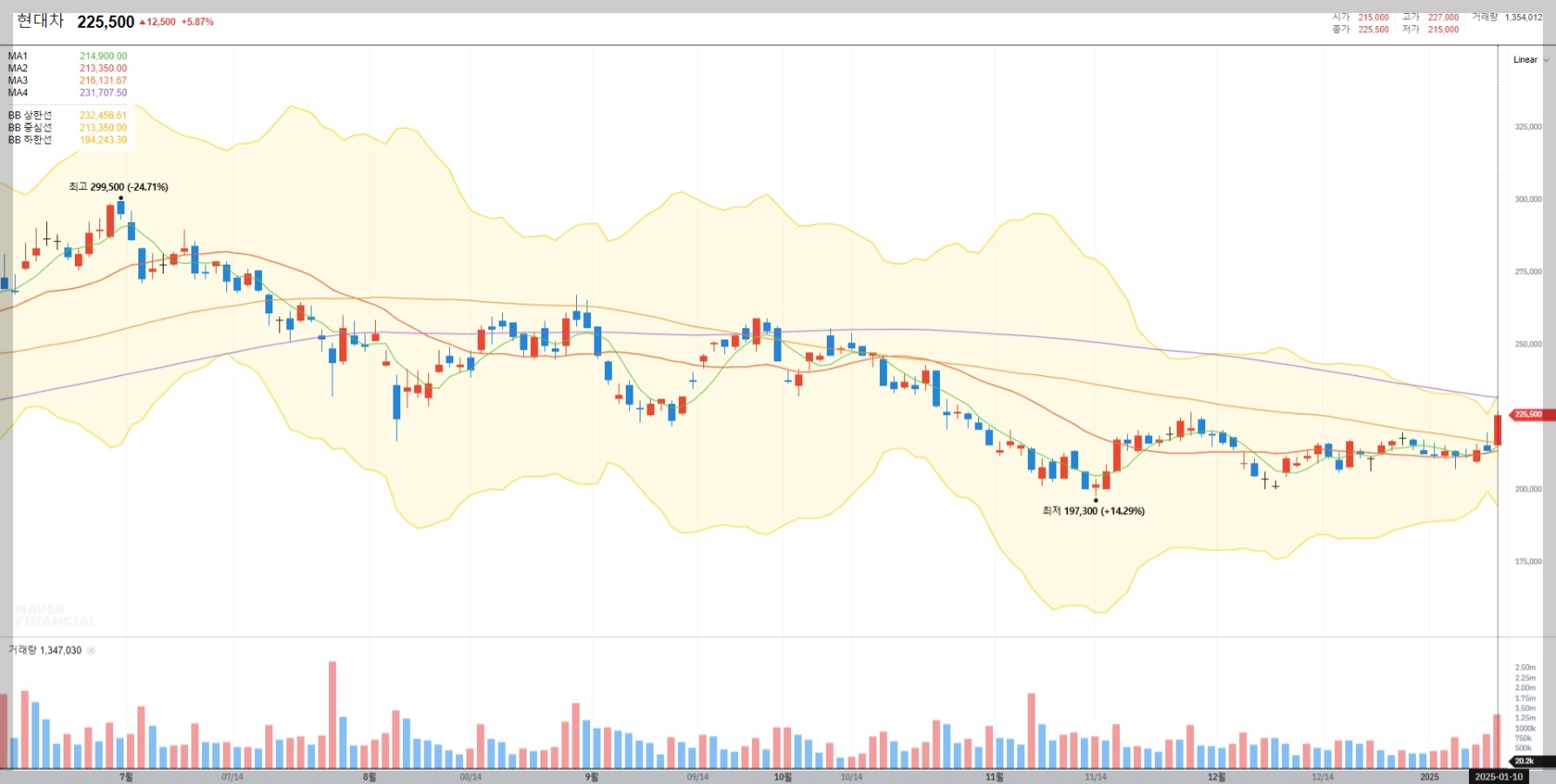 볼린저밴드 지표를 활용한 분석에 따르면, 현재 현대차 주가는 밴드 상단에 위치해 있으며 단기 과매수 구간에 진입할 가능성이 있습니다. 따라서 단기 조정 가능성을 염두에 둔 신중한 접근이 필요합니다.