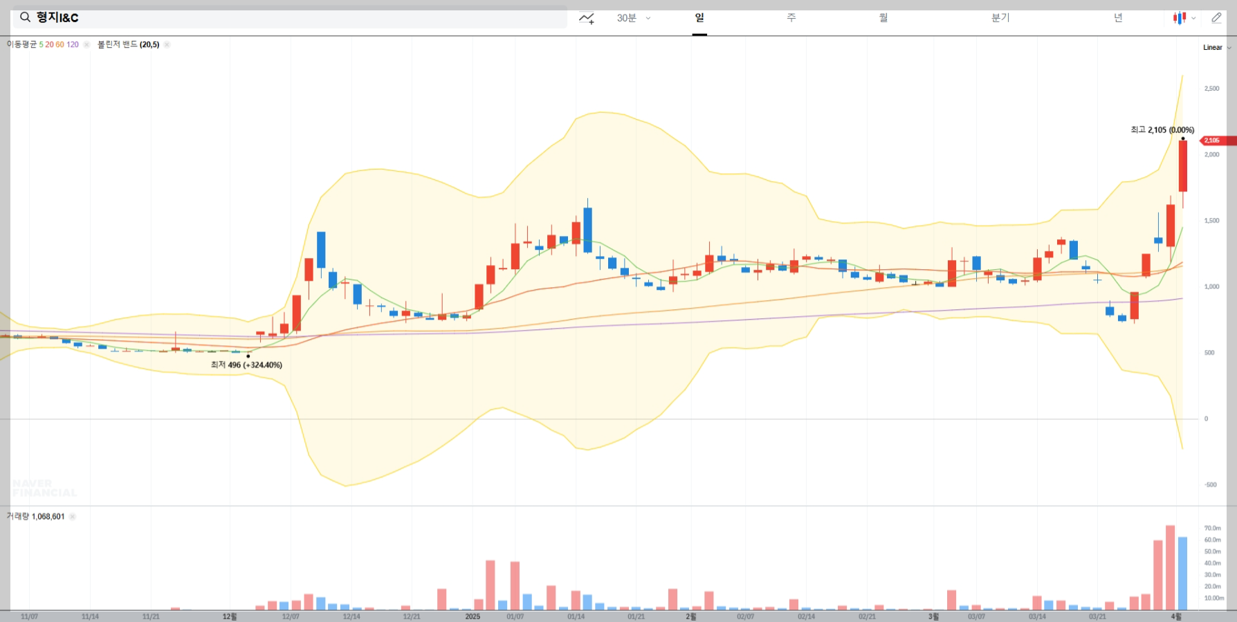 형지I&C의 현재 주가는 2,105원으로, 전일 대비 482원(29.70%) 상승했습니다. 이는 상당히 큰 폭의 상승으로, 시장의 관심이 집중되고 있음을 보여줍니다. 거래량 역시 평소보다 증가한 모습을 보이고 있어, 투자자들의 관심이 높아졌음을 알 수 있습니다.
