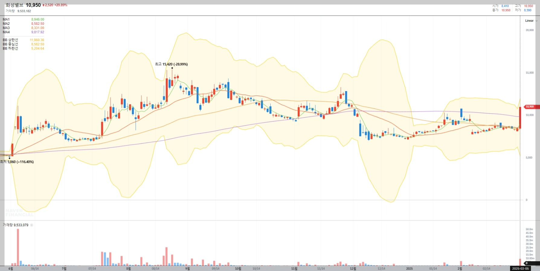2025년 3월 5일 기준 화성밸브의 현재가는 10,950원으로 전일 대비 29.89% 상승했습니다. 최근 상승세는 남-북-러 가스관사업 테마와 관련된 긍정적 뉴스에 기인한 것으로 보입니다.
