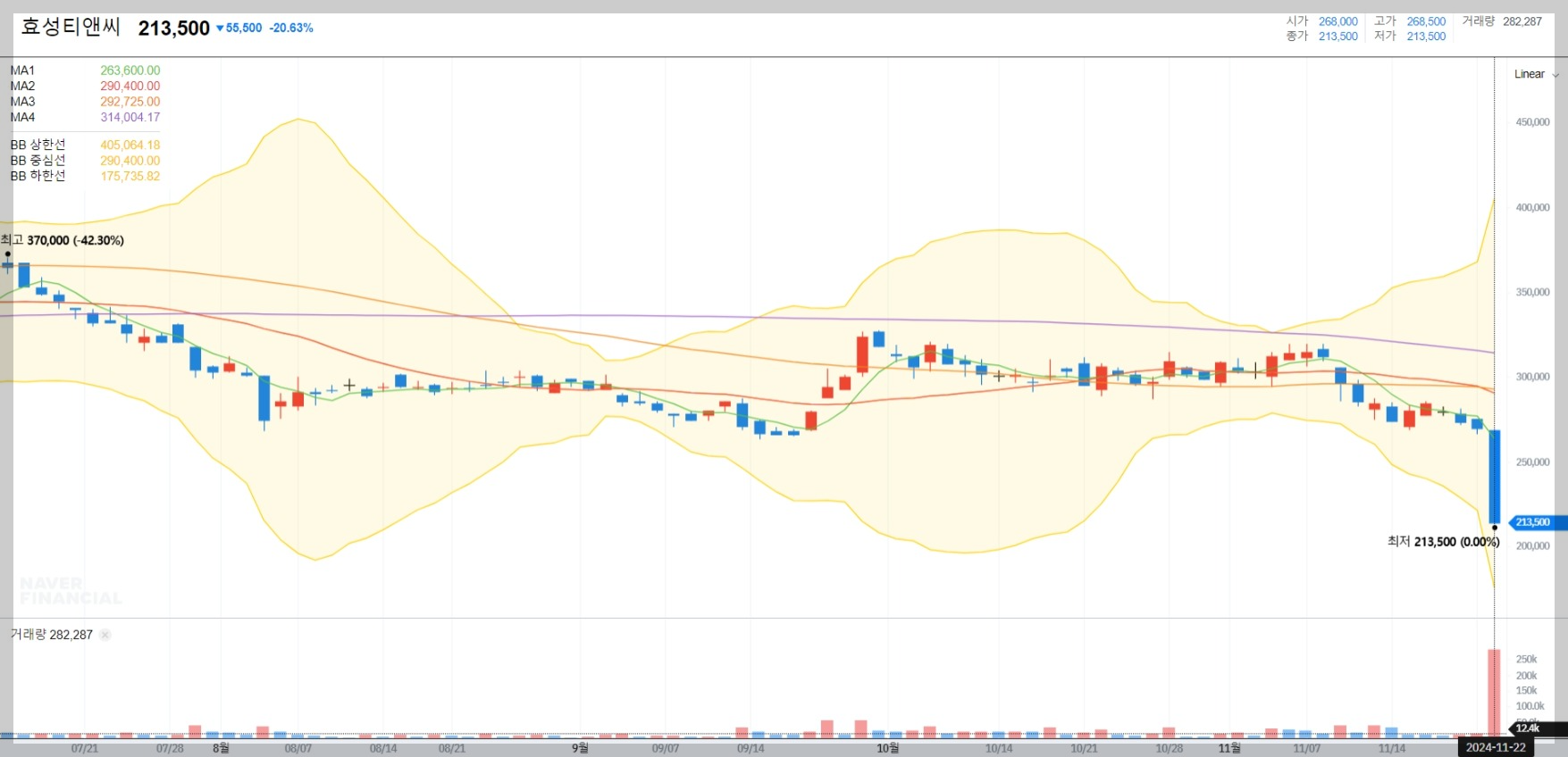 2024년 11월 22일 기준 효성티앤씨의 주가는 213,500원으로 전일 대비 20% 이상 하락했습니다. 이는 특수가스 사업부 인수 관련 우려와 실적 부진이 영향을 미친 것으로 보입니다.