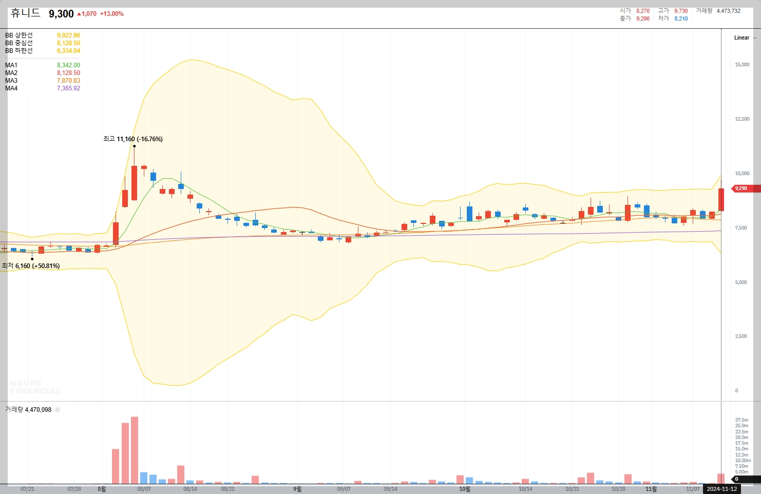 2024년 11월 12일 기준 휴니드의 주가는 9,300원입니다. 전일 대비 1070원(13.00%) 상승했으며, 거래량은 985,732주를 기록했습니다.