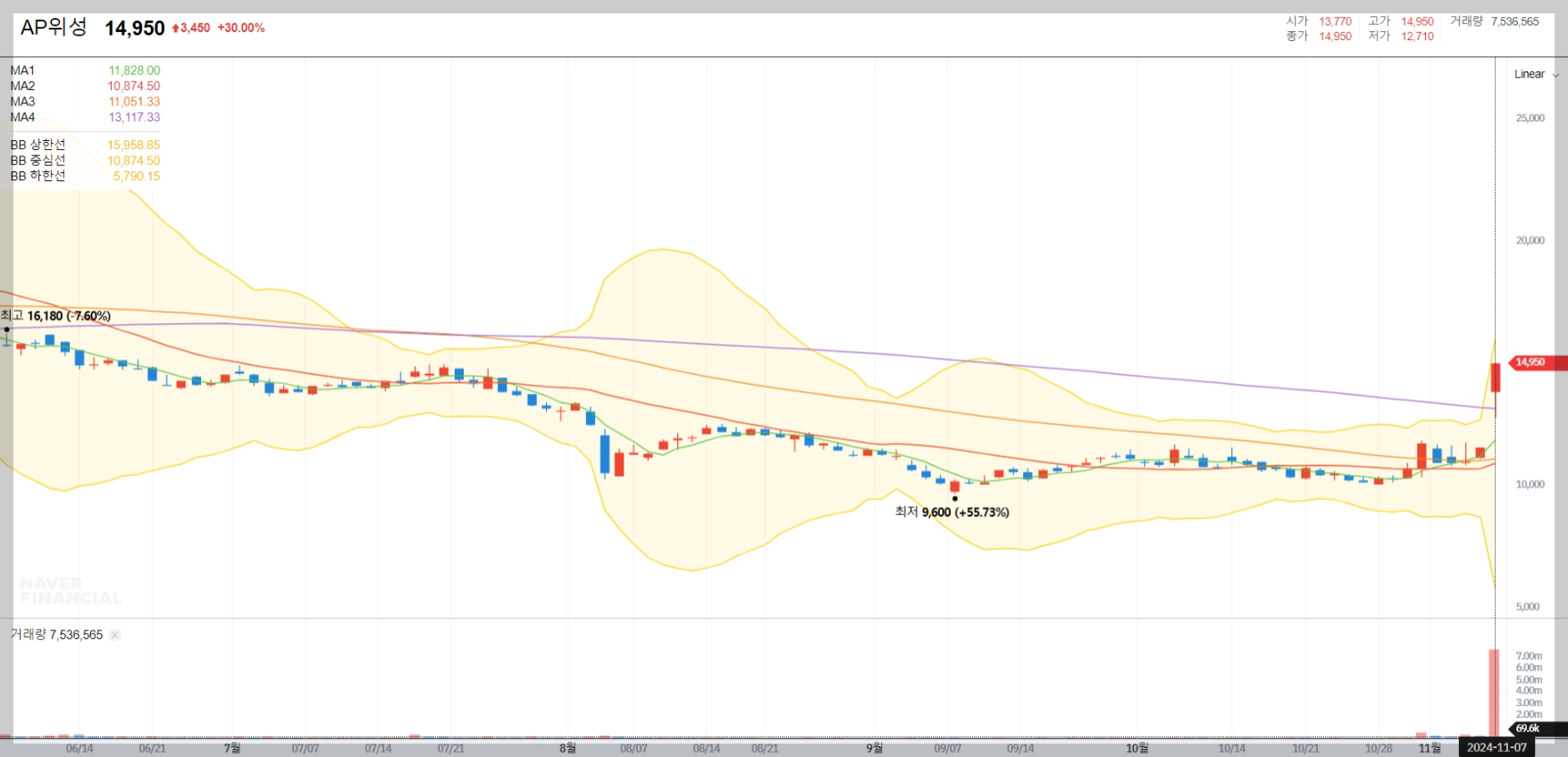 2024년 11월 7일 기준, AP위성의 주가는 14,950원을 기록하고 있습니다. 이는 전일 대비 30.00% 상승한 수치로, 최근 우주산업에 대한 관심 증가와 실적 개선 기대감이 반영된 것으로 보입니다. 52주 최고가는 25,800원, 최저가는 9,430원을 기록했습니다.