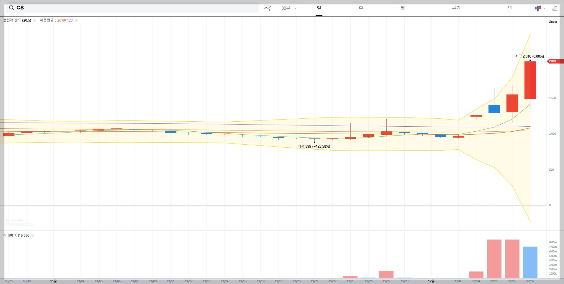 12월 9일 기준 CS의 주가는 2,010원으로 최근 한 달 동안 123% 이상 상승했습니다. 이는 시장 평균 대비 매우 높은 상승률로, 단기적인 과열 가능성도 염두에 두어야 합니다.