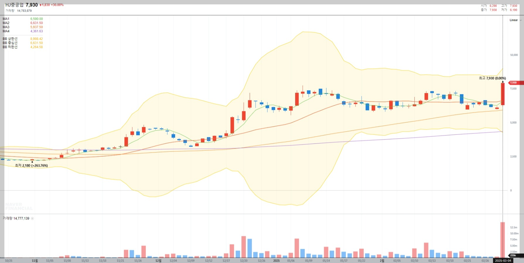 2025년 3월 4일 기준, HJ중공업의 주가는 7,930원으로 전일 대비 30% 상승했습니다. 이는 거래량 증가와 함께 투자자들의 강한 매수세를 반영한 결과입니다.