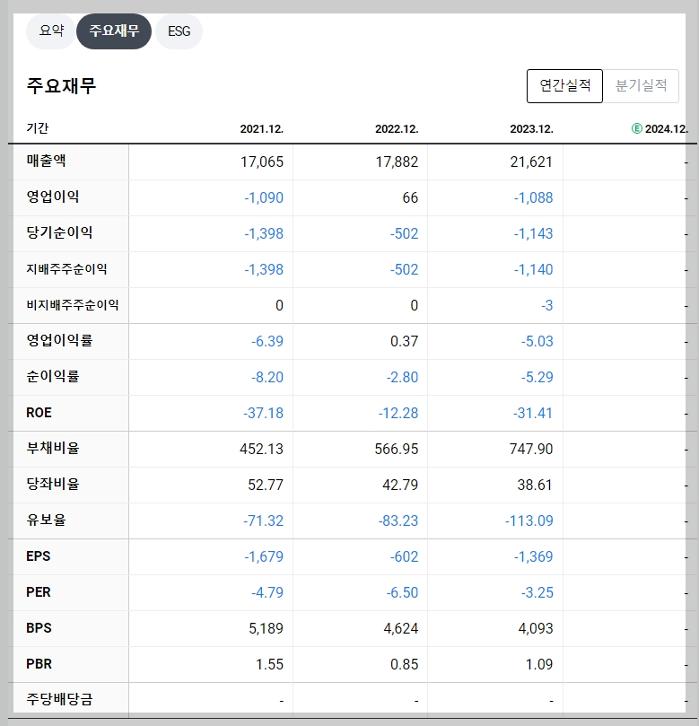 2023년 기준 매출액은 21,621억 원으로 전년 대비 증가했으나 영업이익은 -1,088억 원으로 적자를 기록했습니다. 부채비율은 747.90%로 높은 수준이며 ROE는 -31.41%로 수익성이 낮습니다.