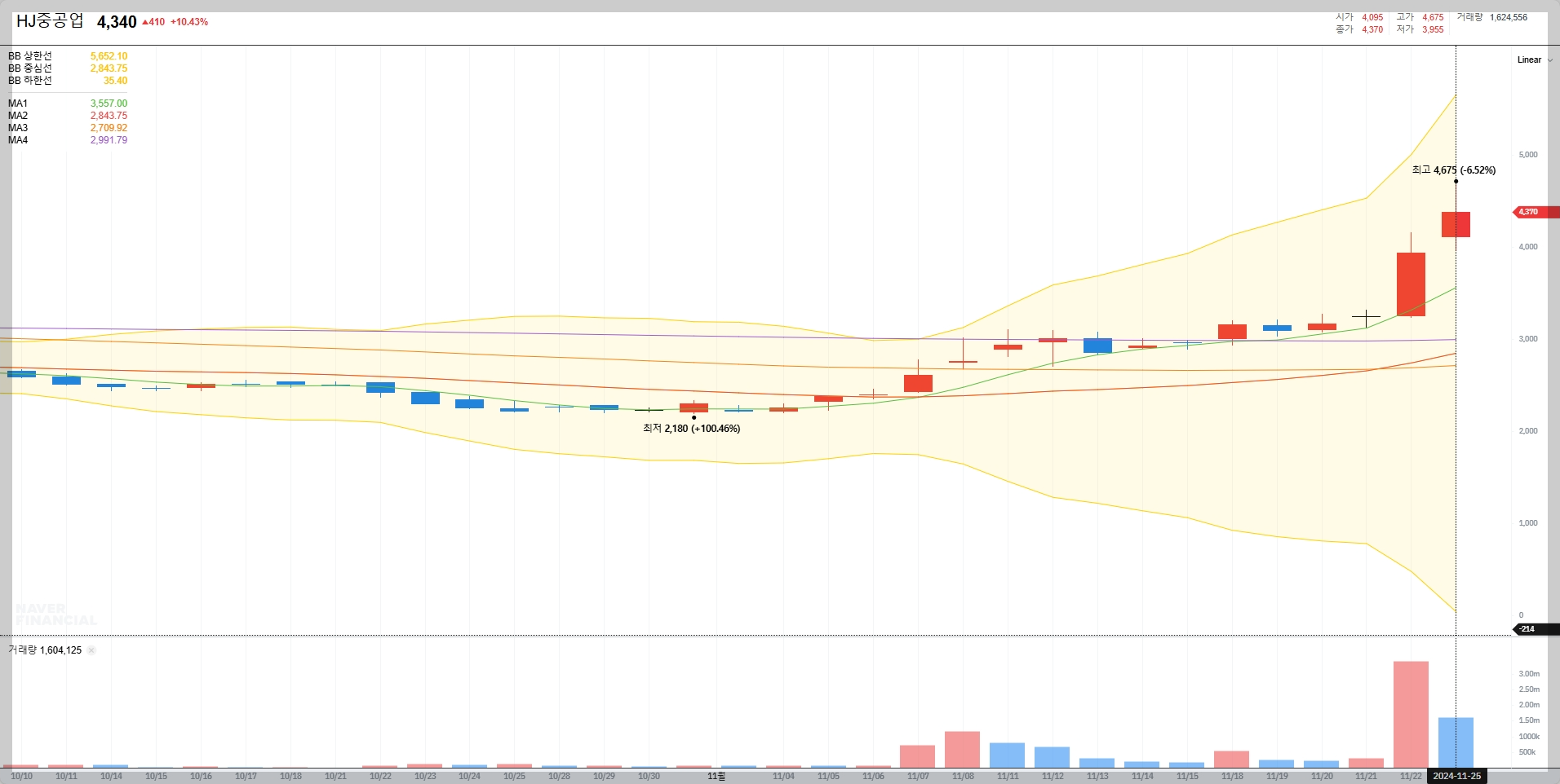 2024년 11월 25일 기준 HJ중공업의 주가는 4,340원으로 전일 대비 10.43% 상승했습니다. 이는 최근 투자자들의 관심 증가와 거래량 급증에 따른 결과로 보입니다.