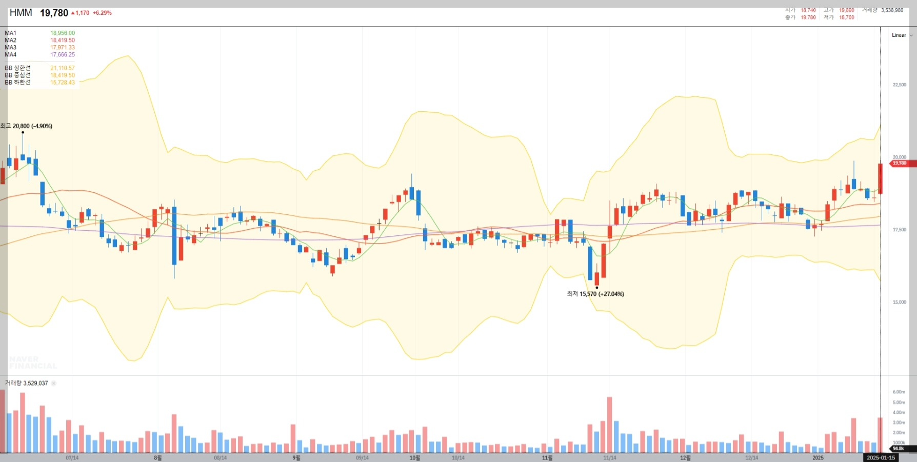 2025년 1월 15일 기준 HMM의 주가는 19,780원으로 거래되고 있으며, 최근 변동성이 증가하고 있습니다. 이는 글로벌 해운 운임 상승과 공급 과잉 우려가 혼재된 결과로 보입니다.