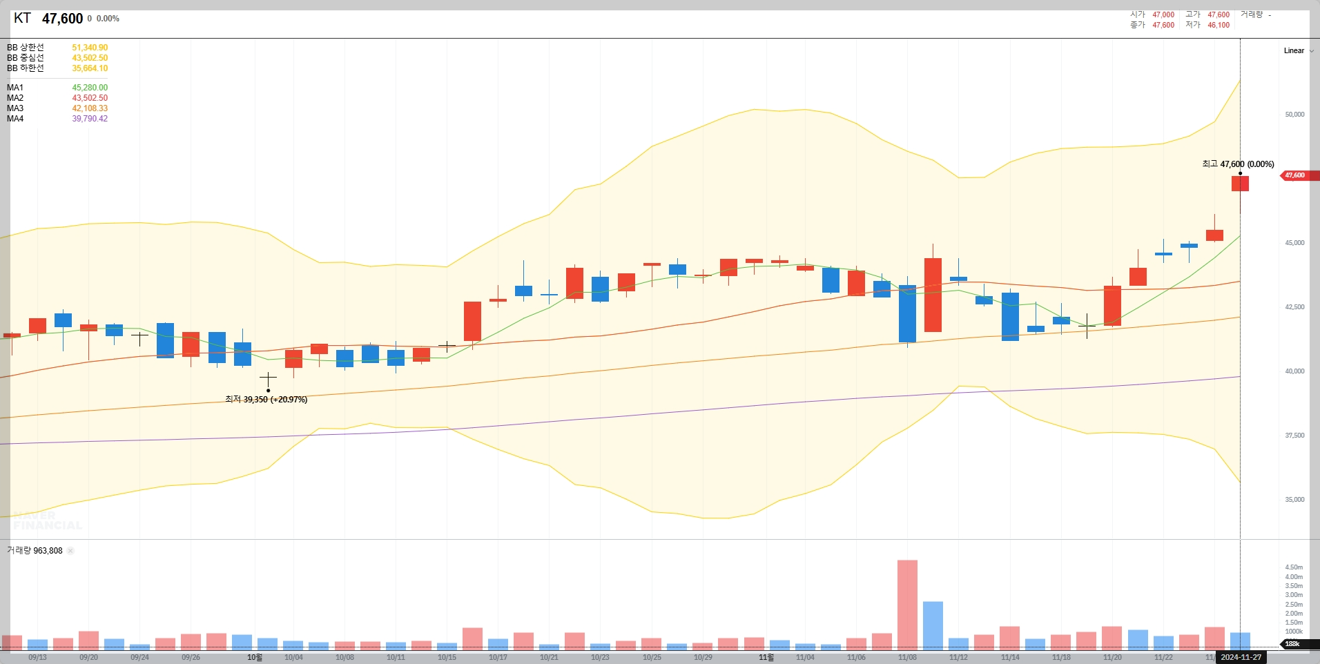 KT의 현재 주가는 47,600원으로 최근 상승세를 보이고 있습니다. 이는 시장의 긍정적인 반응을 반영한 결과입니다.