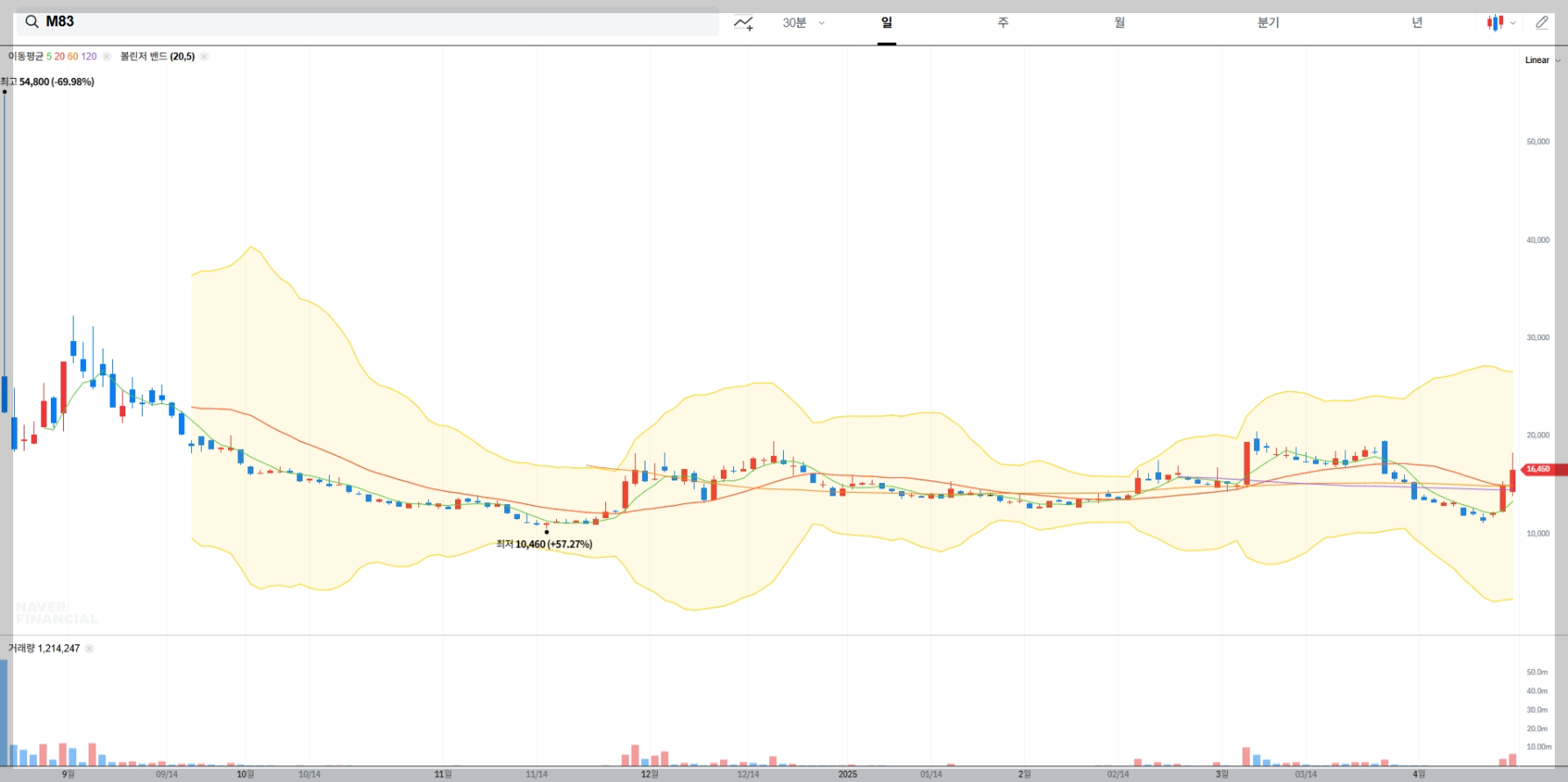 2025년 4월 14일 현재 M83의 주가는 16,920원으로 전일 대비 14.71%(2,170원) 상승했습니다. 최근 주가 흐름을 살펴보면, 4월 10일에는 14,750원으로 마감했으며, 그전에는 12,130원, 11,230원 등 상승세를 보이고 있습니다.
