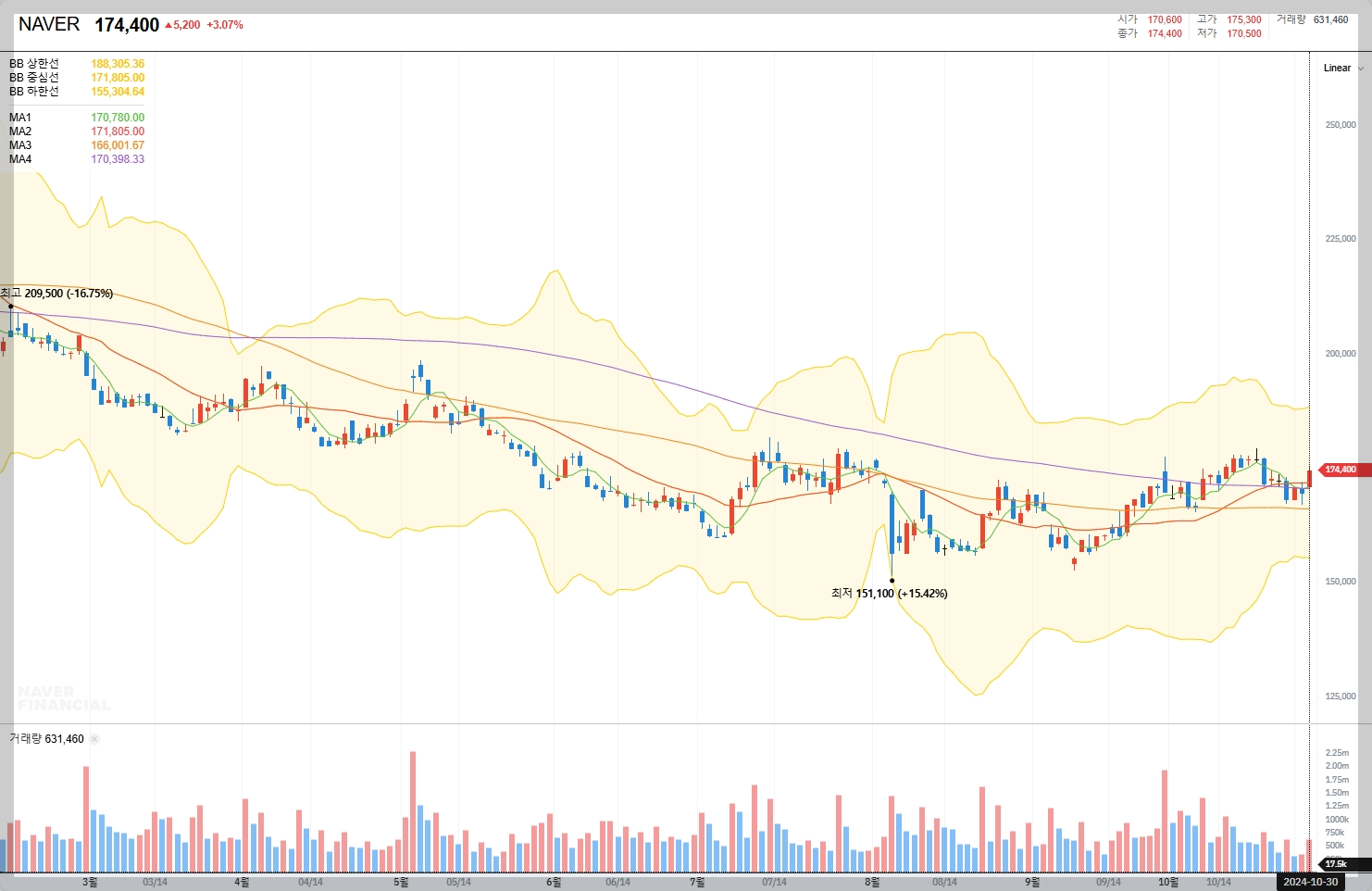 2024년 10월 30일 현재, NAVER의 주가는 174,400원으로, 전일 대비 3.07% 상승하였습니다.