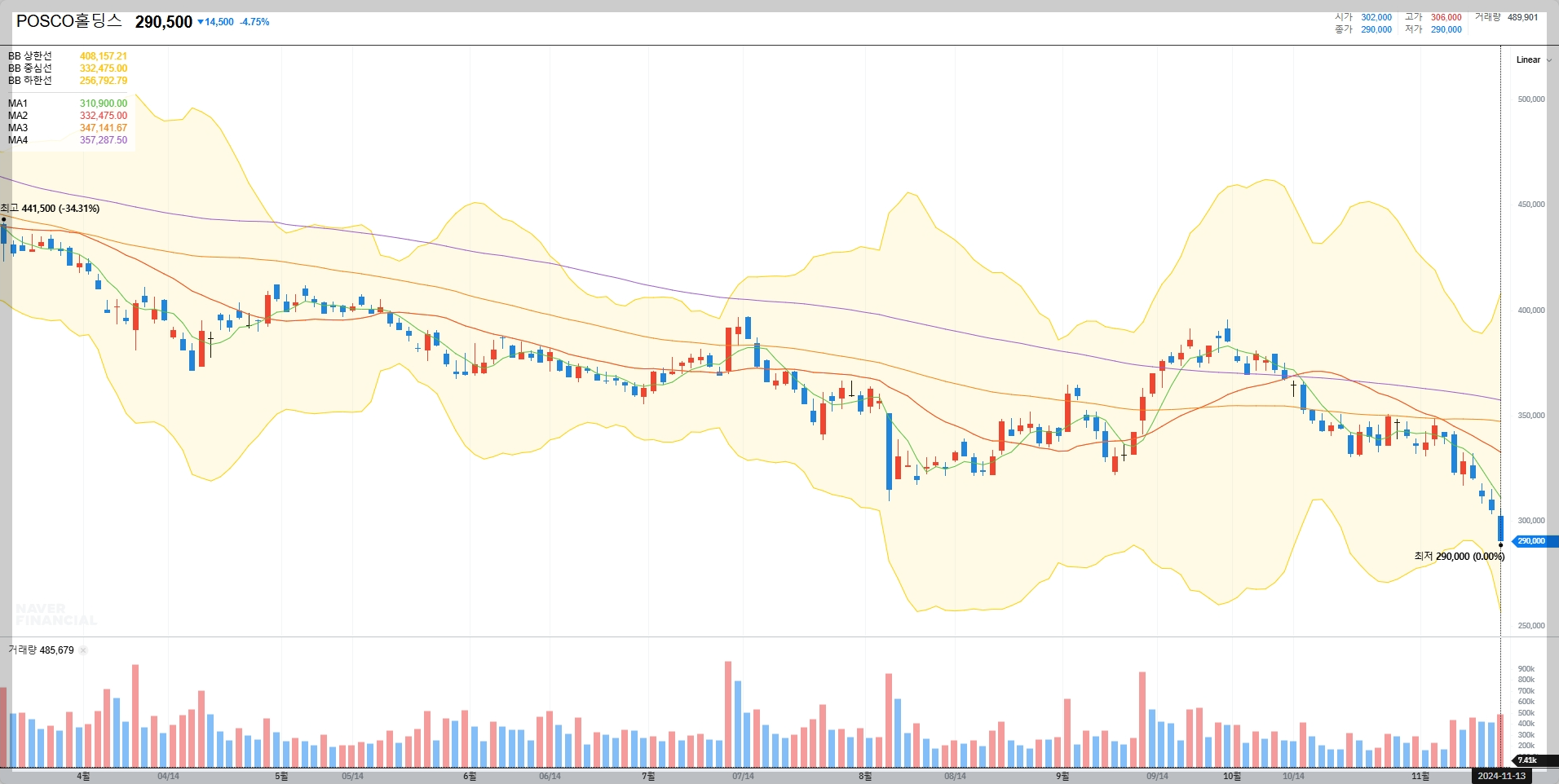 2024년 11월 13일 기준 POSCO홀딩스의 주가는 290,500원으로 마감되었습니다. 이는 최근 몇 달 동안 하락세를 보인 이후 회복세를 나타내는 모습입니다. 아래 차트에서 볼 수 있듯이, POSCO홀딩스의 주가는 2024년 초반 최고점인 441,500원에서 크게 하락했습니다.