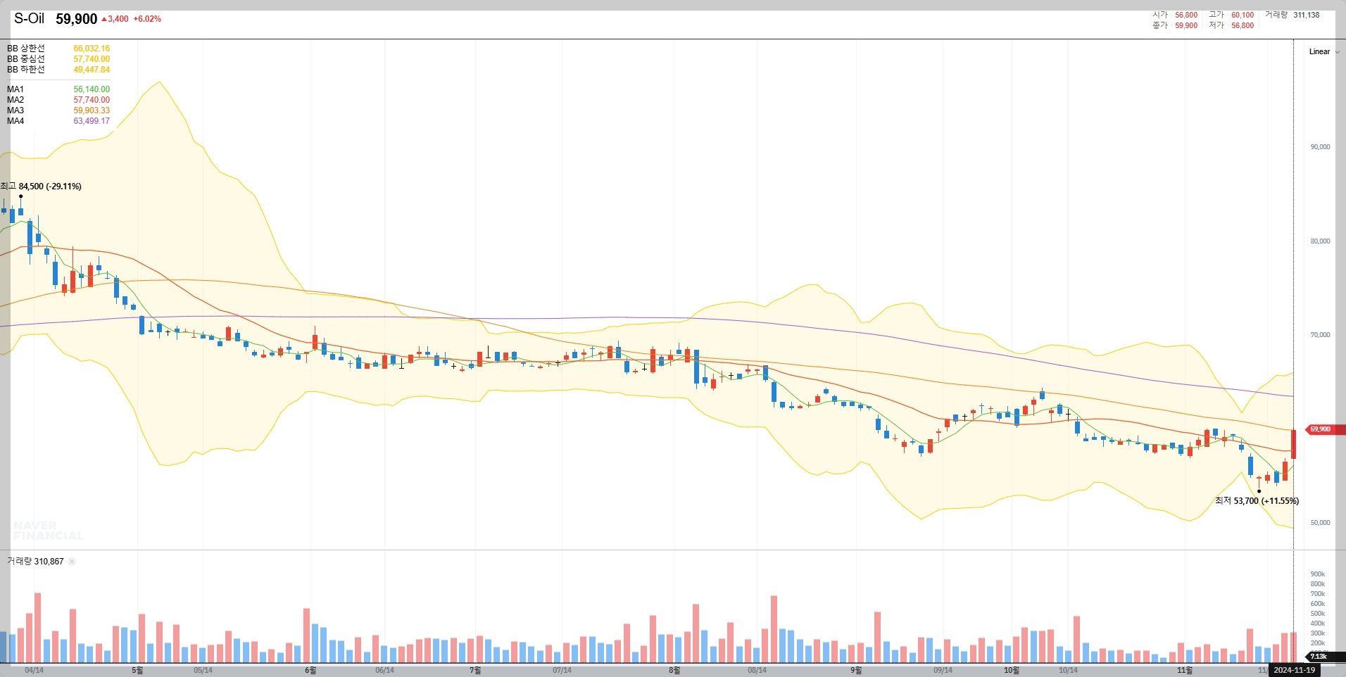 2024년 11월 19일 기준 S-Oil의 주가는 59,900원으로 기록되었습니다. 이는 최근 저점인 53,700원에서 반등한 수치입니다. 그러나 여전히 연초 대비 약 21% 하락한 상태로, 투자자들은 향후 주가 회복 가능성에 대해 관심을 기울이고 있습니다.