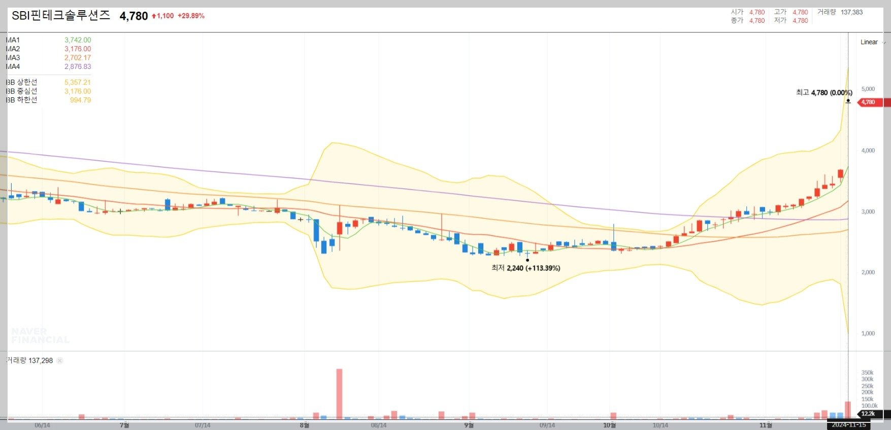 최근 SBI핀테크솔루션즈의 주가는 급격히 상승하며 투자자들의 이목을 집중시키고 있습니다. 특히 2024년 11월 15일 기준으로 29.89% 상승하여 4,780원을 기록하였습니다. 이는 최근 발표된 긍정적인 실적과 더불어 시장에서의 기대감이 반영된 결과로 보입니다.