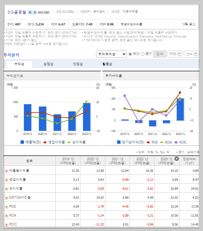 SG글로벌 전일 주가는 2,850원이며 전일 대비 305원 상승한 모습을 보이고 있습니다. SG글로벌의 주주현황을 살펴보면 에스지고려 주주가 전체 지분 58.53%를 소유하고 있습니다. SG글로벌은 자동차부품 기업으로 장중 기준으로 주가는 2,850원입니다. SG글로벌의 시가 총액은 1419억 원이며 발행 주식수는 44,964,143주입니다. 외국인 보유 비중은 2.28%이며 장중 거래량은 1,630,757원 을 기록했습니다. 매출액은 253억 원을 달성했습니다. EPS는 487원이며 SG글로벌 주식 배당수익률은 0.00%입니다.