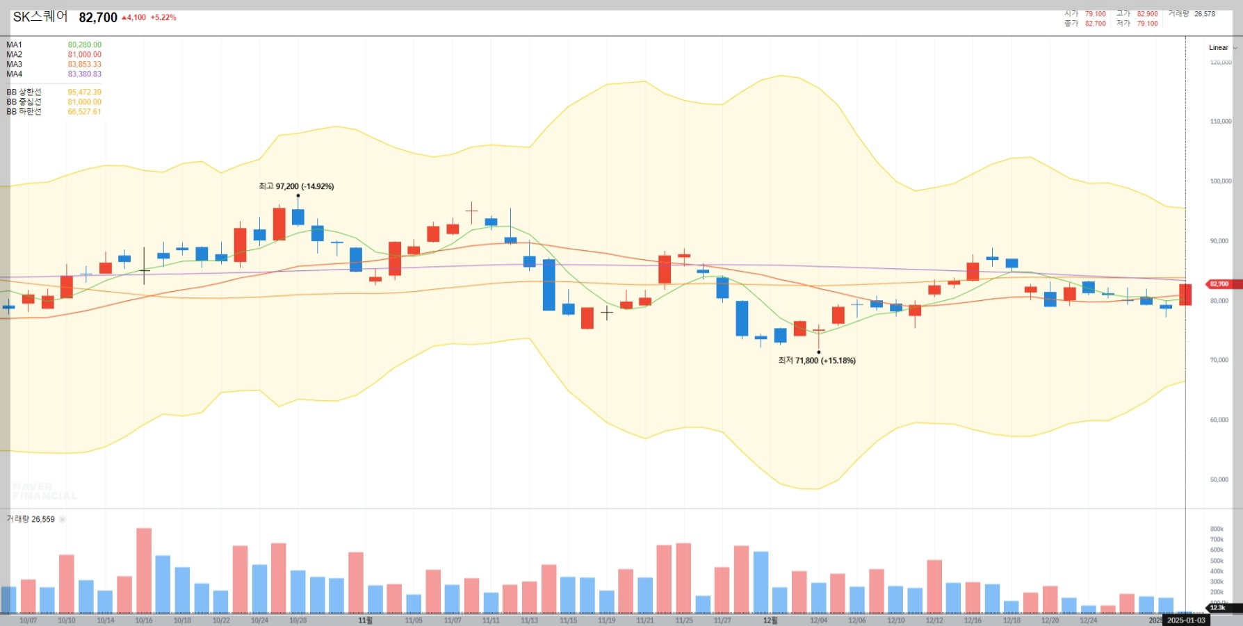 2025년 1월 3일 기준 SK스퀘어의 주가는 82,700원으로 전일 대비 5.22% 상승했습니다. 최근 볼린저밴드 상단에 근접하며 기술적 상승세를 보이고 있습니다.
