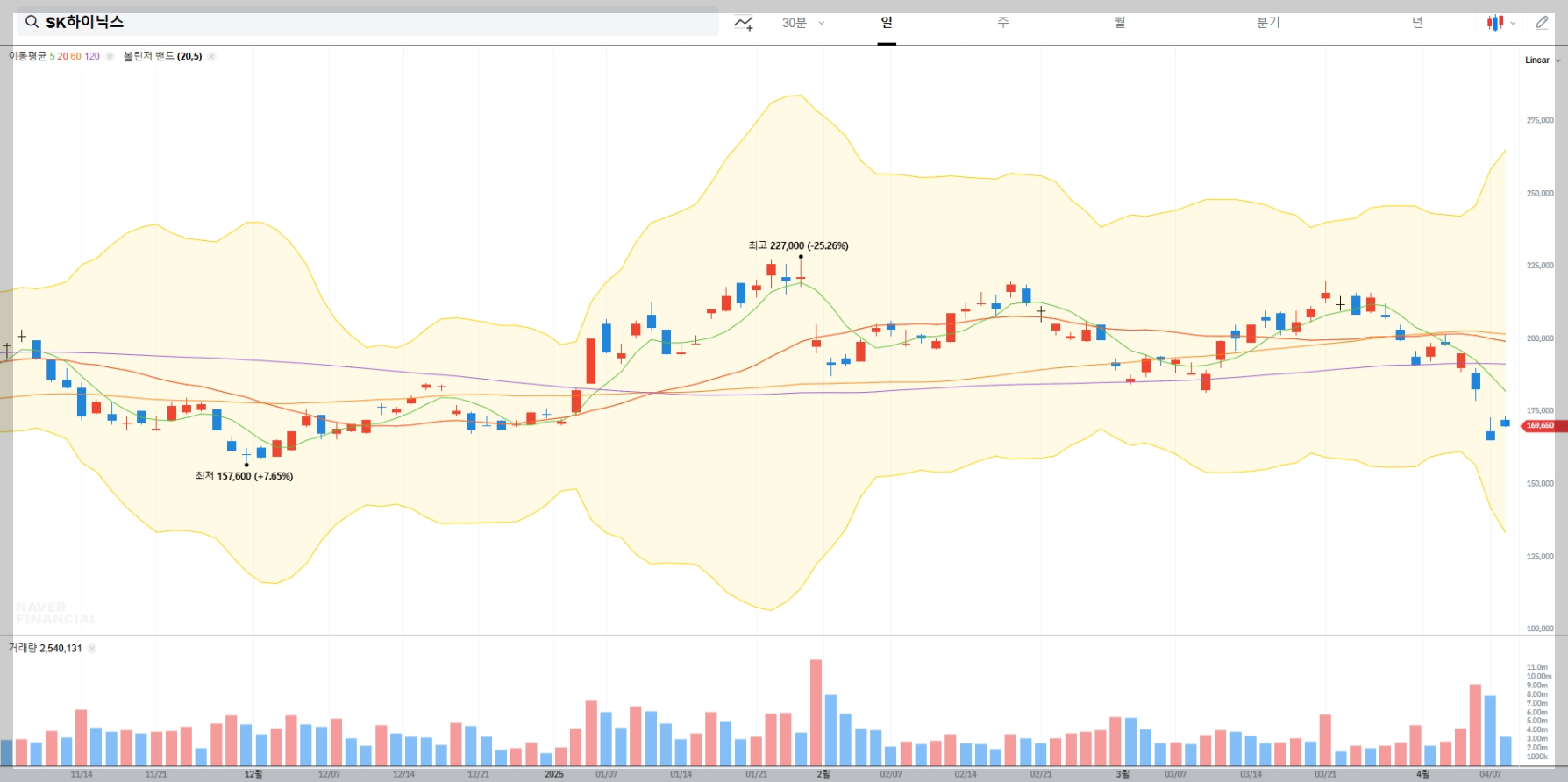 볼린저밴드는 주가 변동성을 분석하는 데 유용한 도구입니다. 현재 SK하이닉스는 상단 밴드 근처에서 거래되고 있어 단기적으로 과매수 상태일 가능성이 있습니다. 그러나 장기적인 추세는 여전히 긍정적입니다.