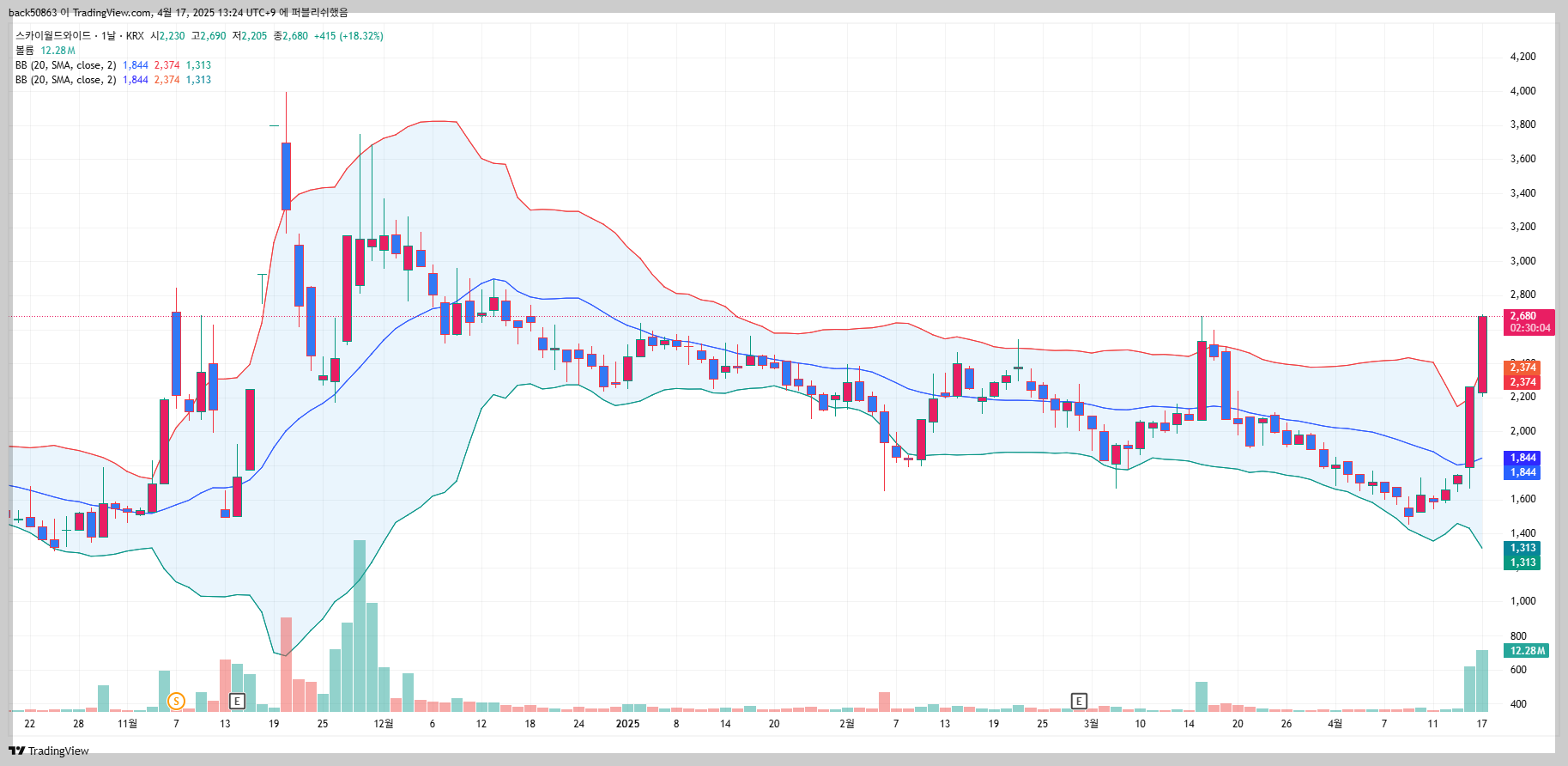 현재 주가는 볼린저밴드 상단을 돌파한 상태로, 강한 상승 모멘텀을 보여주고 있습니다. 다만 일봉차트상 2,500원 부근 위로 단기 매물대 저항이 있으나 비교적 약한 편이어서, 이를 돌파할 경우 일시적으로 강한 상승이 나올 수 있습니다.