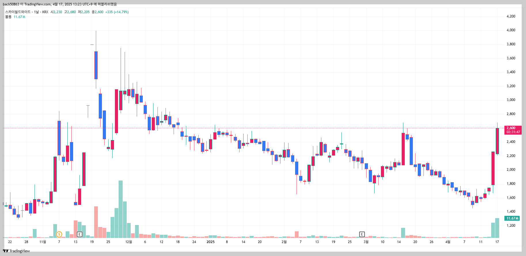 SKAI 주가 일봉차트를 분석해 보면, 지난해 11월 디렉터스컴퍼니 매각 소식 등에 강한 변동성을 보였고, 이후 하락하며 저점을 계속해서 낮추어가고 있었습니다. 그러다가 최근 서서히 반등이 나오다가 엔비디아 피지컬 AI 관련 모멘텀과 함께 민주당의 AI 정책 등에 힘입어 상한가를 기록했습니다.