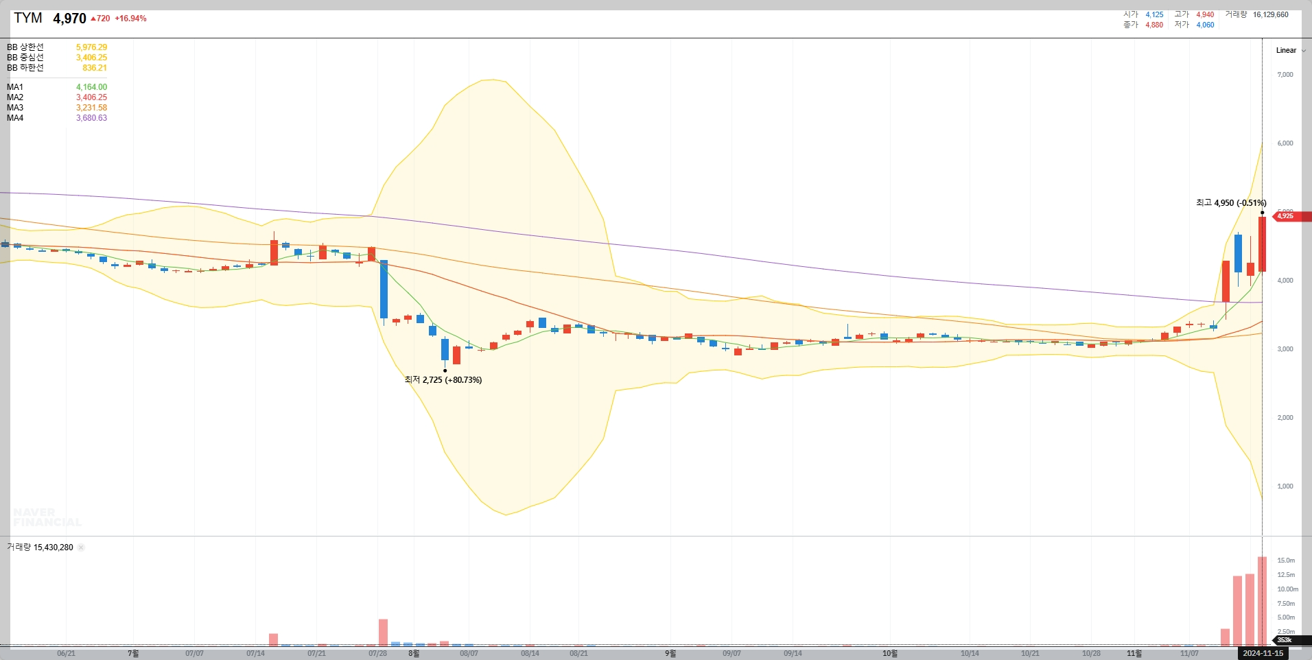 2024년 11월 15일 기준 TYM의 주가는 4,970원으로, 전일 대비 약 16.94% 상승했습니다. 이는 최근 몇 달간의 하락세를 뒤집는 강력한 반등으로 해석될 수 있습니다. 특히 볼린저밴드 상단을 돌파하며 기술적 분석에서 긍정적인 신호를 보이고 있습니다.